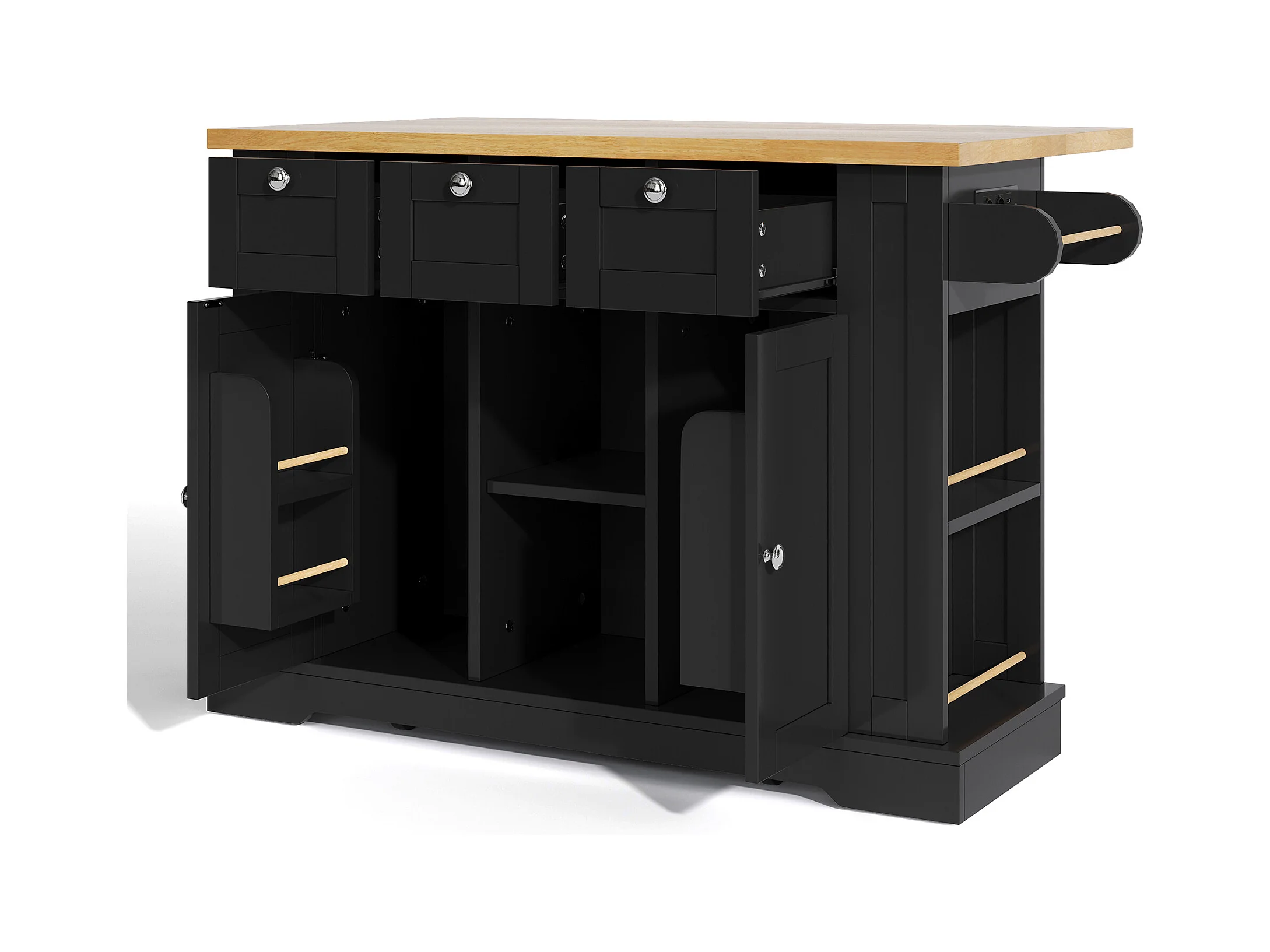 Îlot central mobile avec plateau en bois, 3 portes texturées et étagère à épices - noir