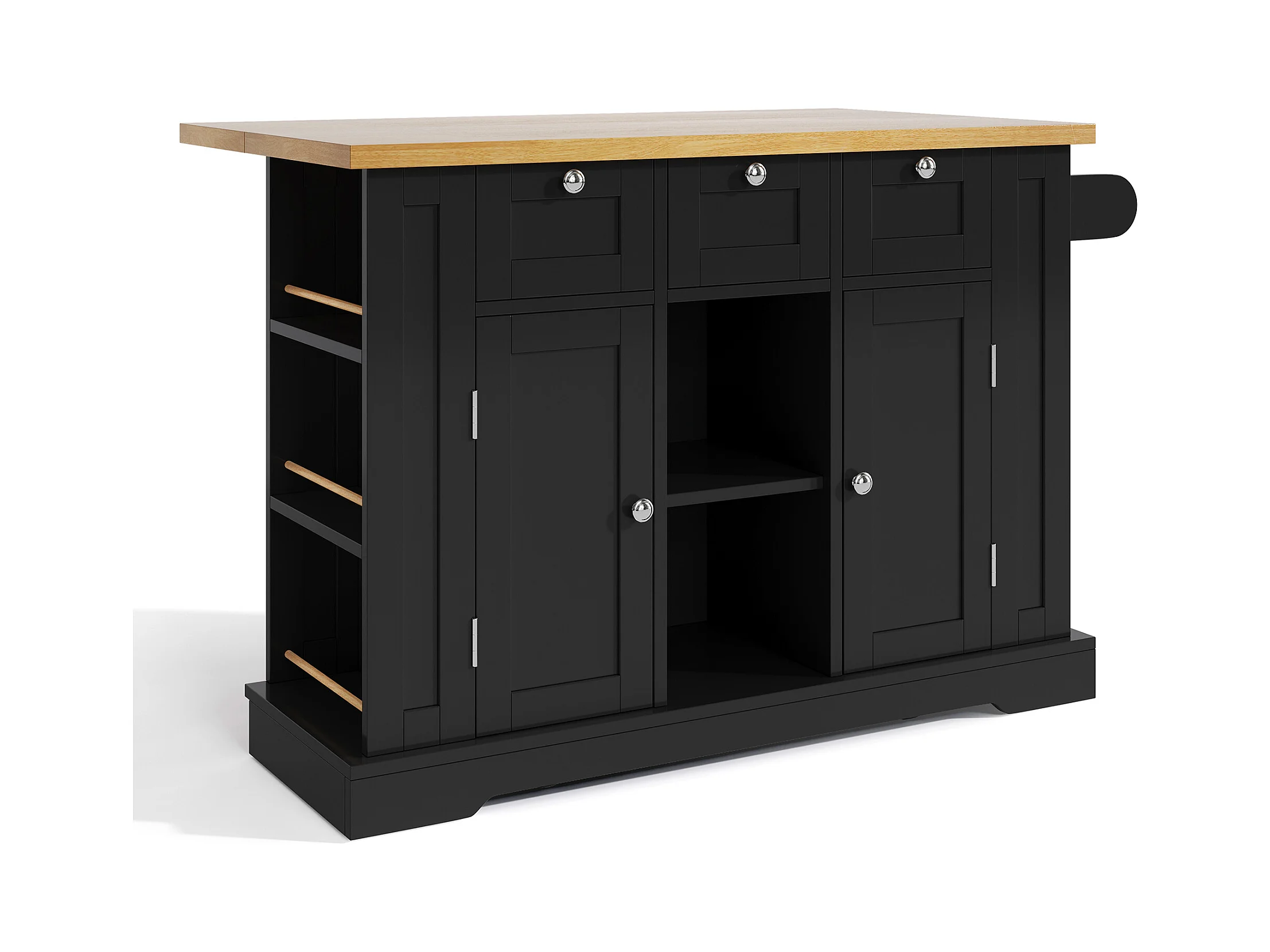 Îlot central mobile avec plateau rabattable, 3 portes et 2 tiroirs de rangement - Noir