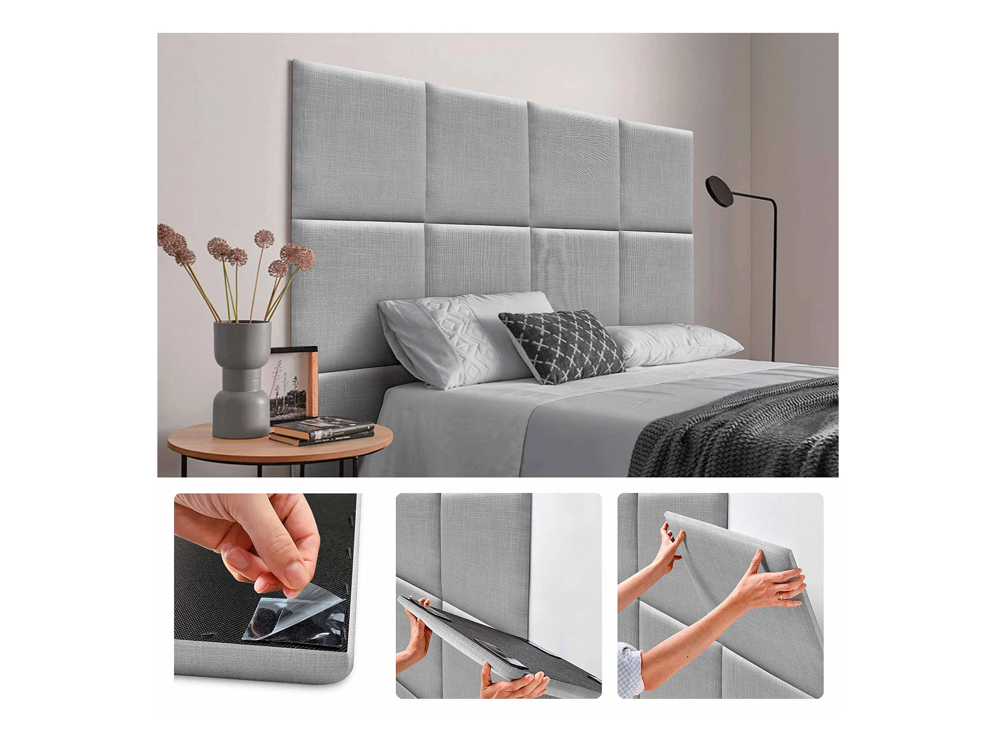 DHOME Ensemble de 8 Panneaux muraux en lin autocollants, absorption acoustique, protection contre les chocs et Têtes de Lit (Gris Clair, 50x50cm, x8)