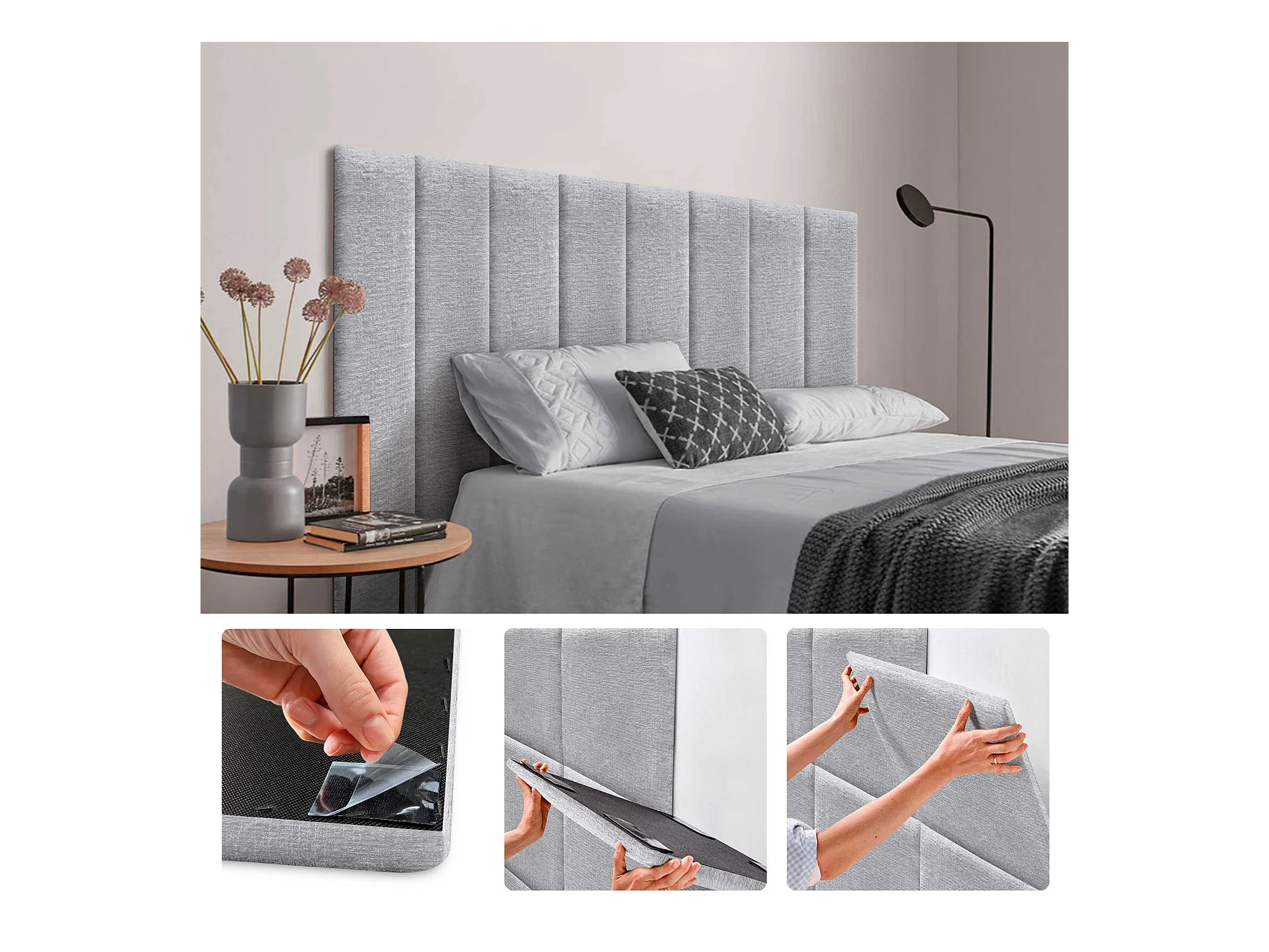 DHOME Tête de lit capitonnée en lin naturel composée de panneaux autocollants interchangeables pour chambre de luxe rembourrée (gris clair, 135 cm)
