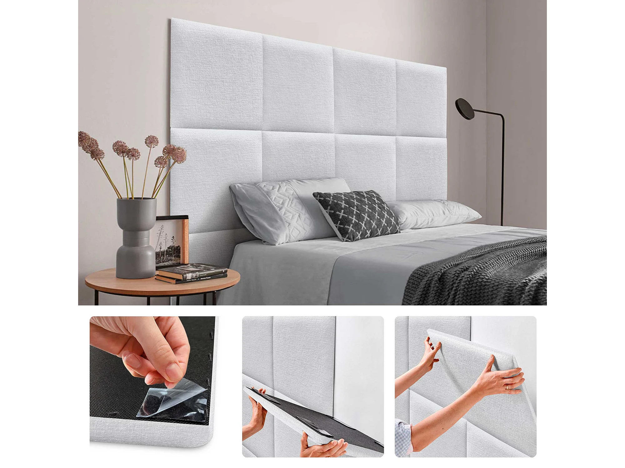 DHOME Lot de 4 panneaux muraux acoustiques auto-adhésifs en laine écologique protection absorbante contre les chocs (Blanc, 50 x 50 cm, x4)
