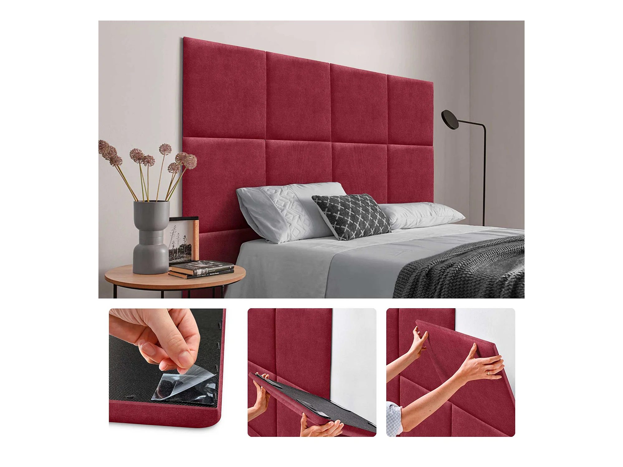 DHOME Tête de lit tapissée en tissu Aqualine composée de panneaux de lit autocollants interchangeables pour chambre de luxe (Rouge, 90 cm)