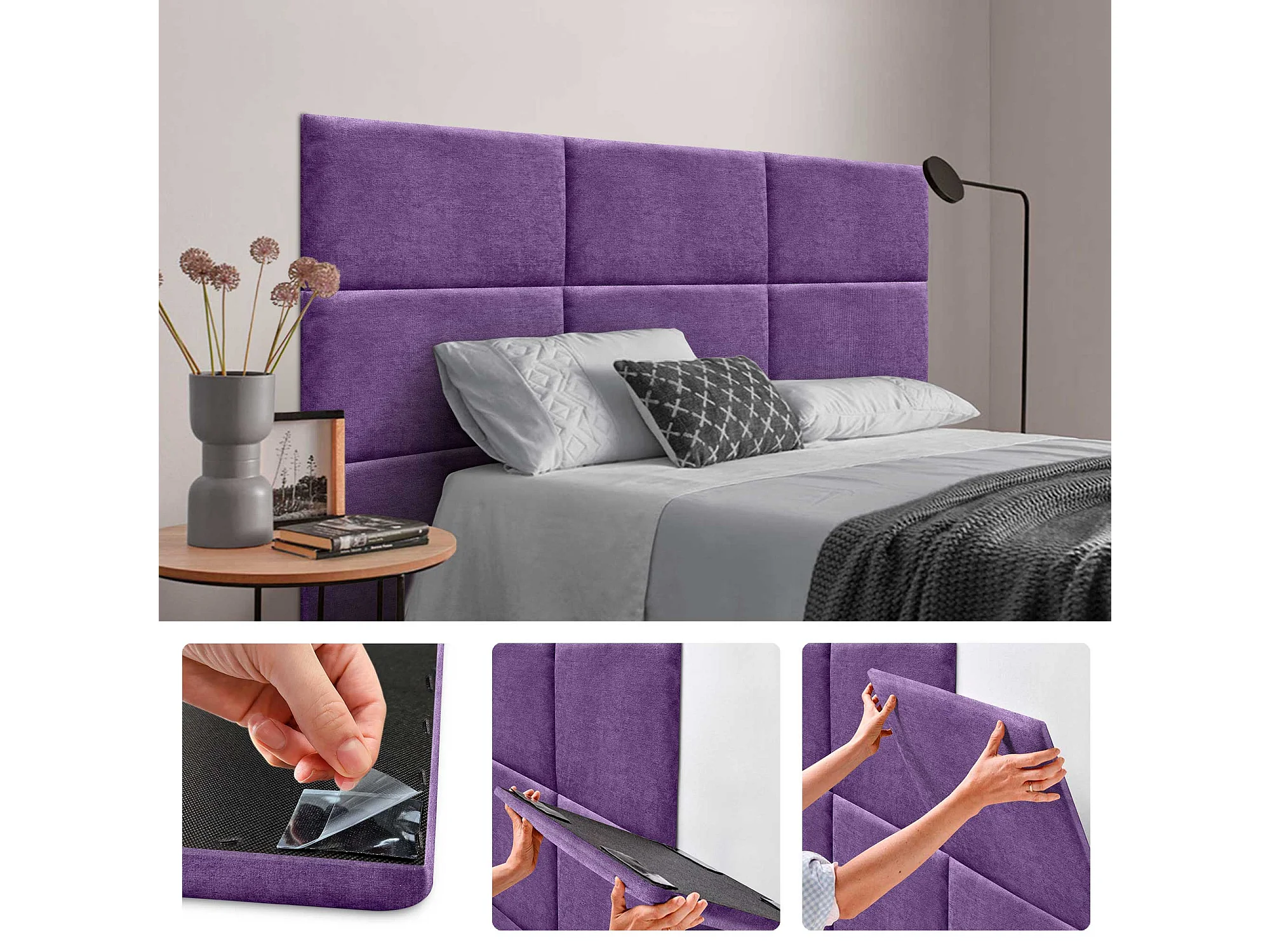 DHOME Lot de 8 Panneaux Rembourrés en Tissu Aqualine Autocollants pour Mur Acoustiques Absorbants Protection contre les Chocs (Lilas, 50x30cm, x8)