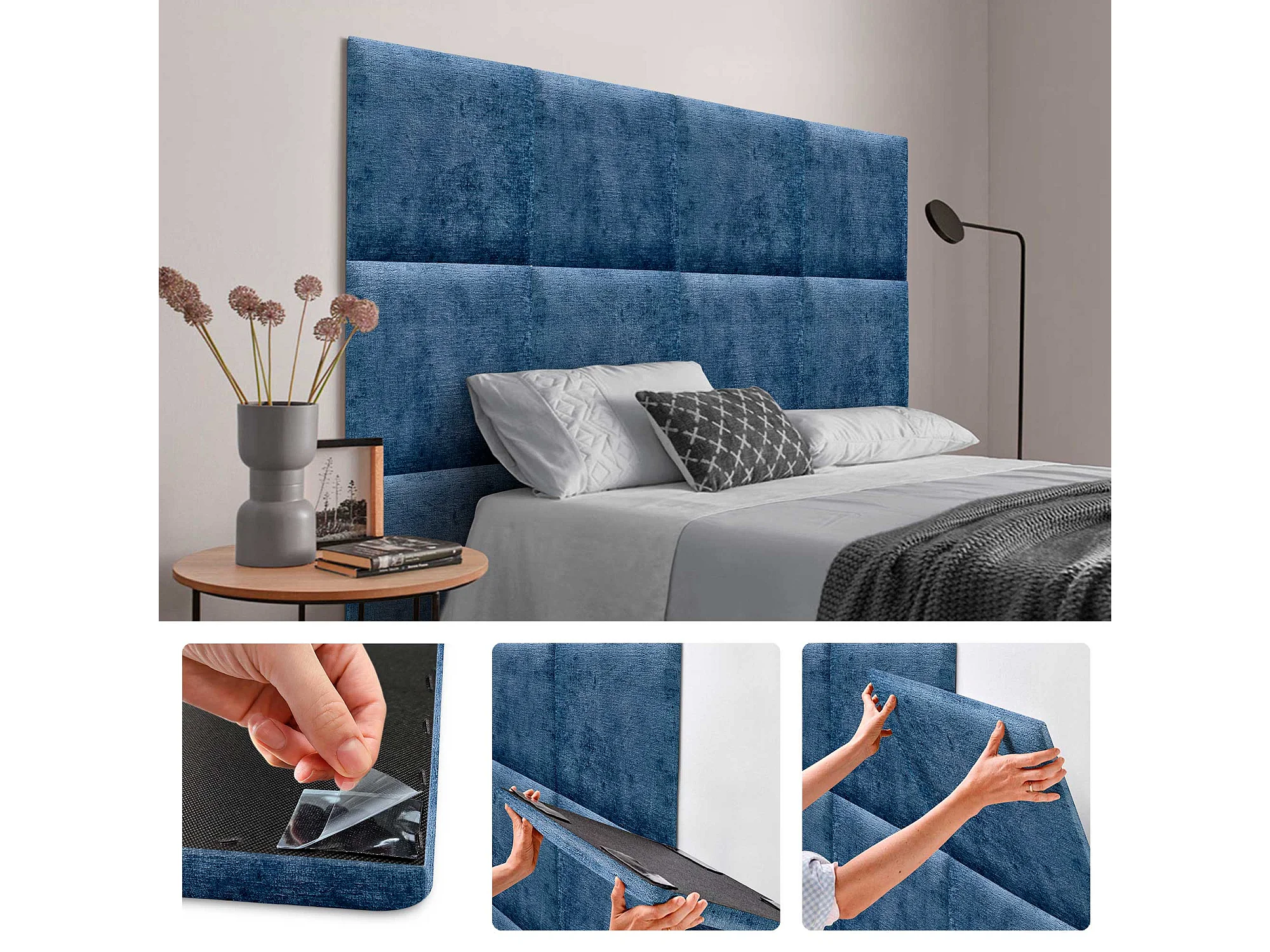 DHOME Tête de Lit Rembourrée en Laine Écologique Composée de Panneaux Autocollants Interchangeables Chambre de Luxe Rembourrée (Bleu, 140 cm)