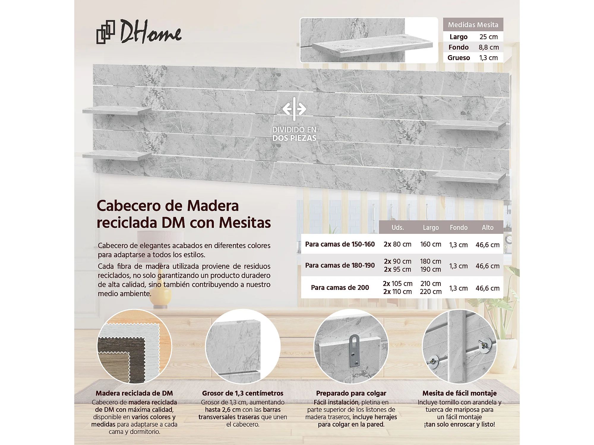 DHOME Tête de lit avec étagères en bois recyclé DM à suspendre au mur horizontal de style palette avec pieds de lit vintage nordique (finition marbre 270 cm)