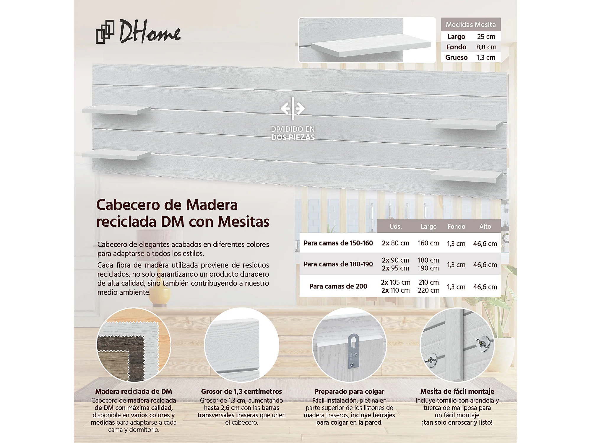 DHOME Tête de lit avec étagères en bois recyclé DM à suspendre au mur style palette horizontale avec pieds lit vintage nordique (bois blanc 210 cm)