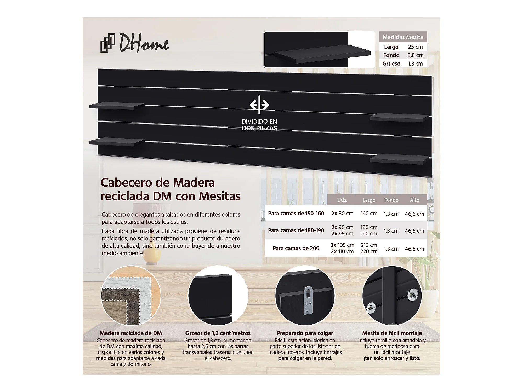 DHOME Tête de lit avec étagères en bois recyclé DM à suspendre au mur style palette horizontale avec pieds lit vintage nordique (290 cm noir massif)