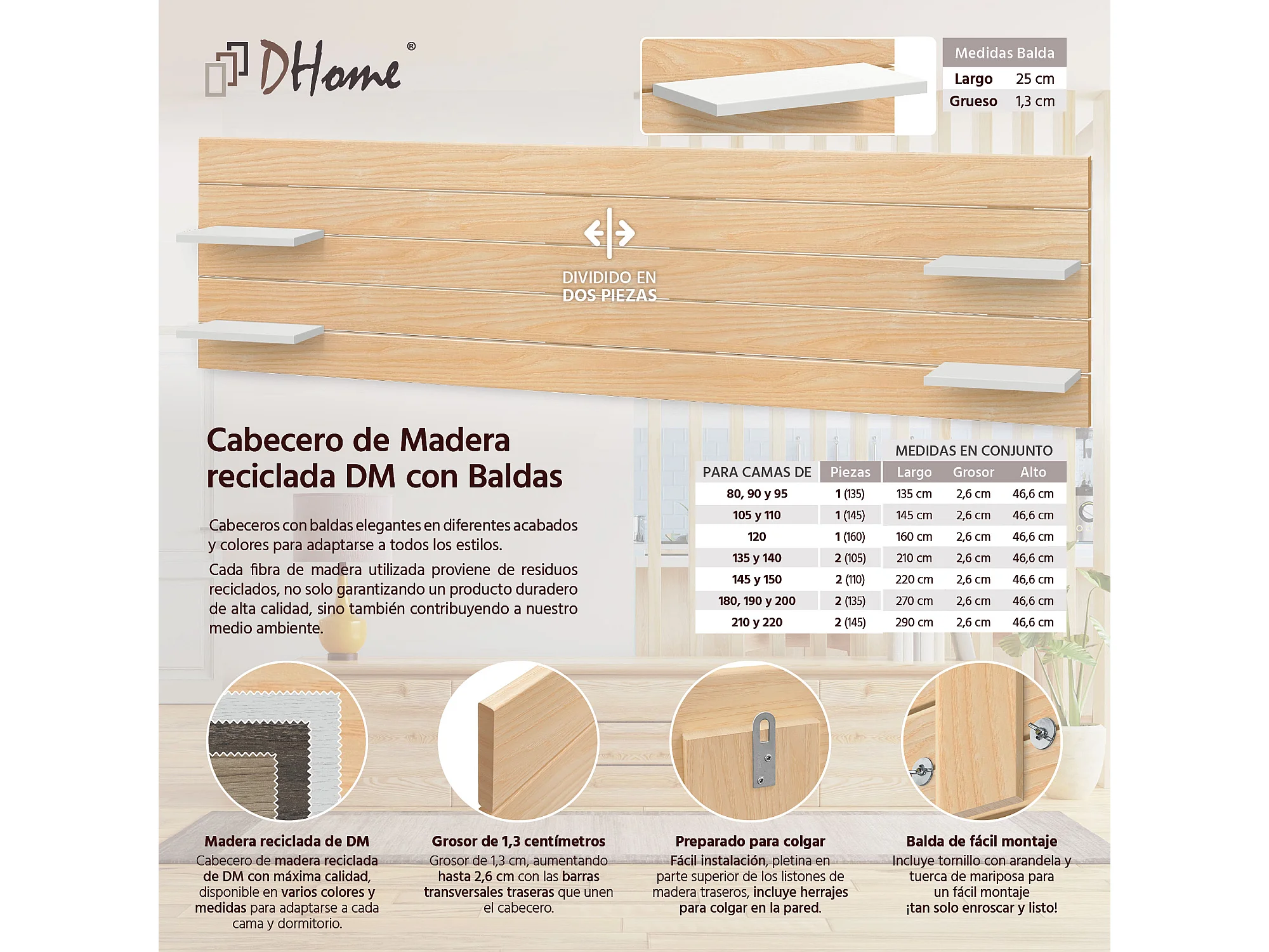 DHOME Tête de lit avec étagères en bois recyclé DM Lit mural horizontal de style palette Nordic (bois naturel/blanc, 220 cm double)
