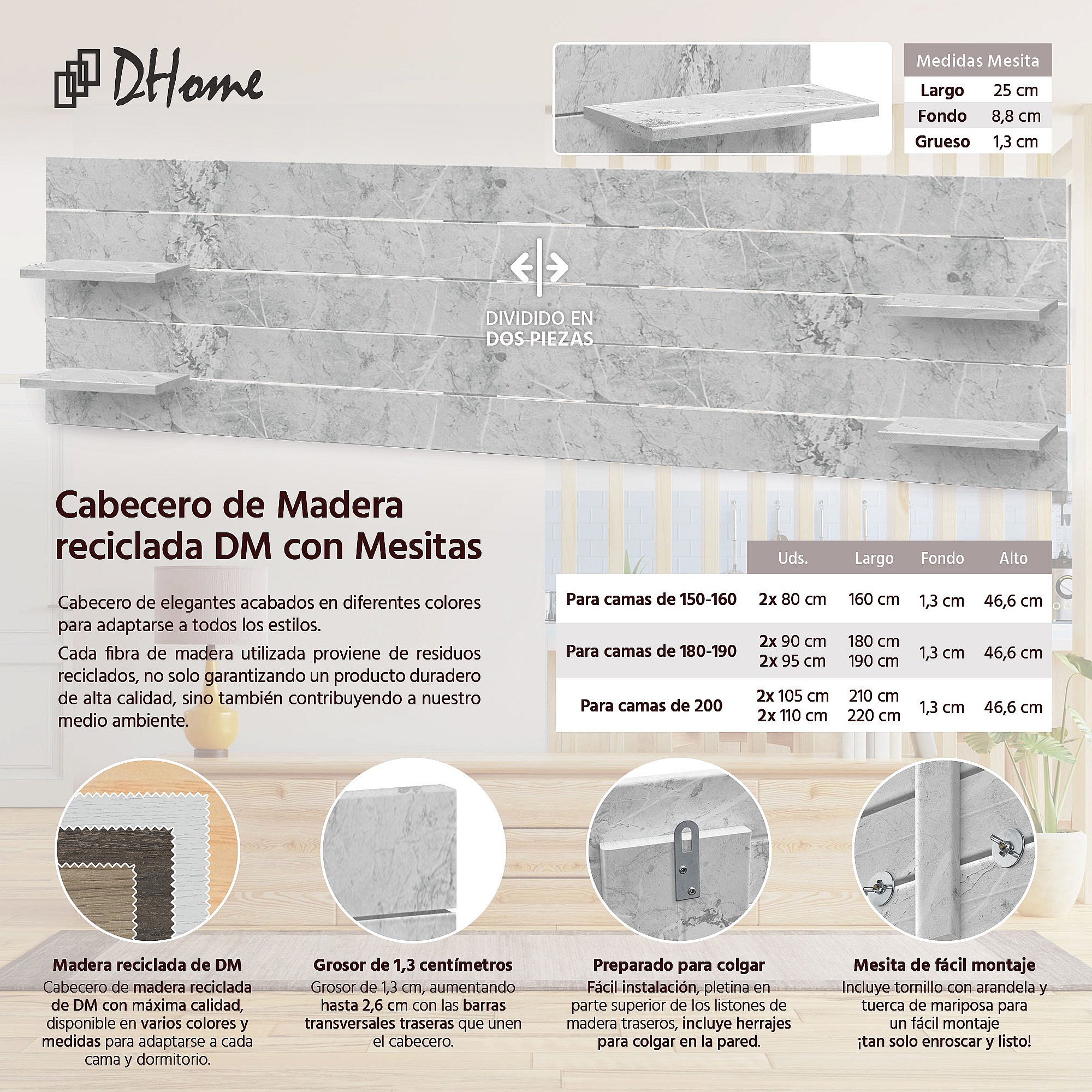 DHOME Tête de lit avec étagères en bois recyclé DM Tenture murale horizontale Style palette Lit nordique vintage (finition marbre 270 cm)