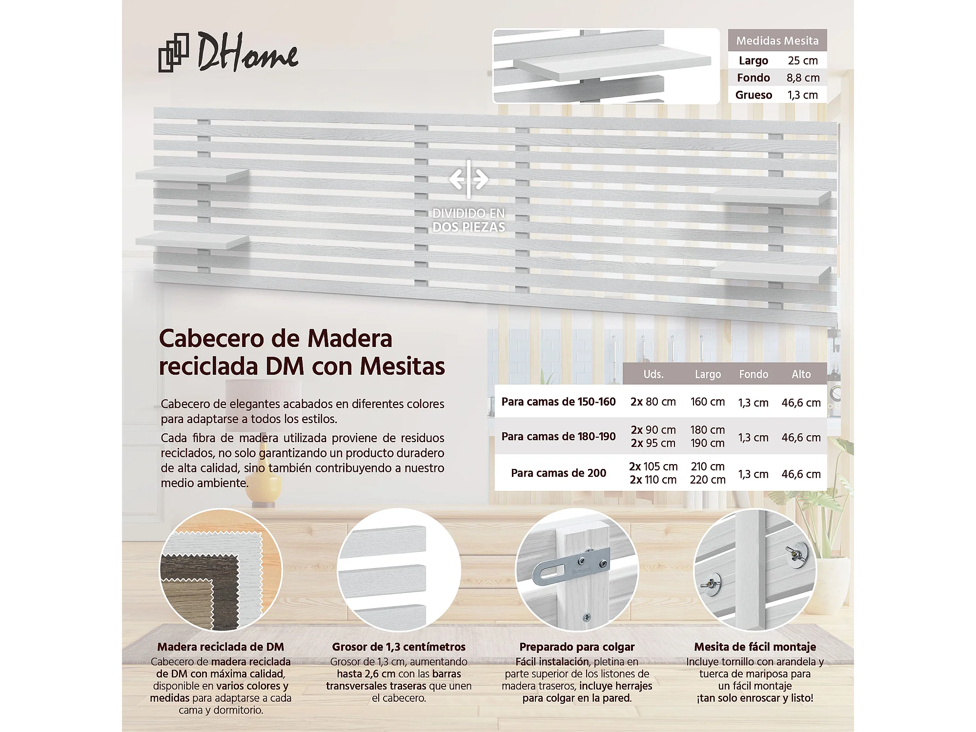 1. DHOME Tête de Lit DM Bois Recyclé Double Style Palette Japonaise Divisée en 2 Pièces 190x46cm Lits 190 - Arctique