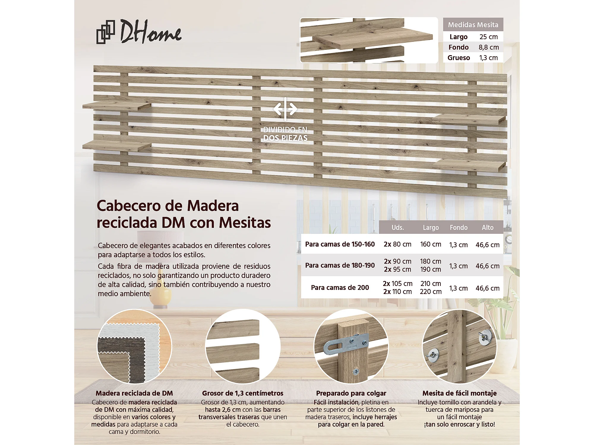 10. DHOME Tête de Lit DM Bois Recyclé Double Style Palette Japonaise Divisée en 2 Pièces 220x46cm Lits 220 - Chêne