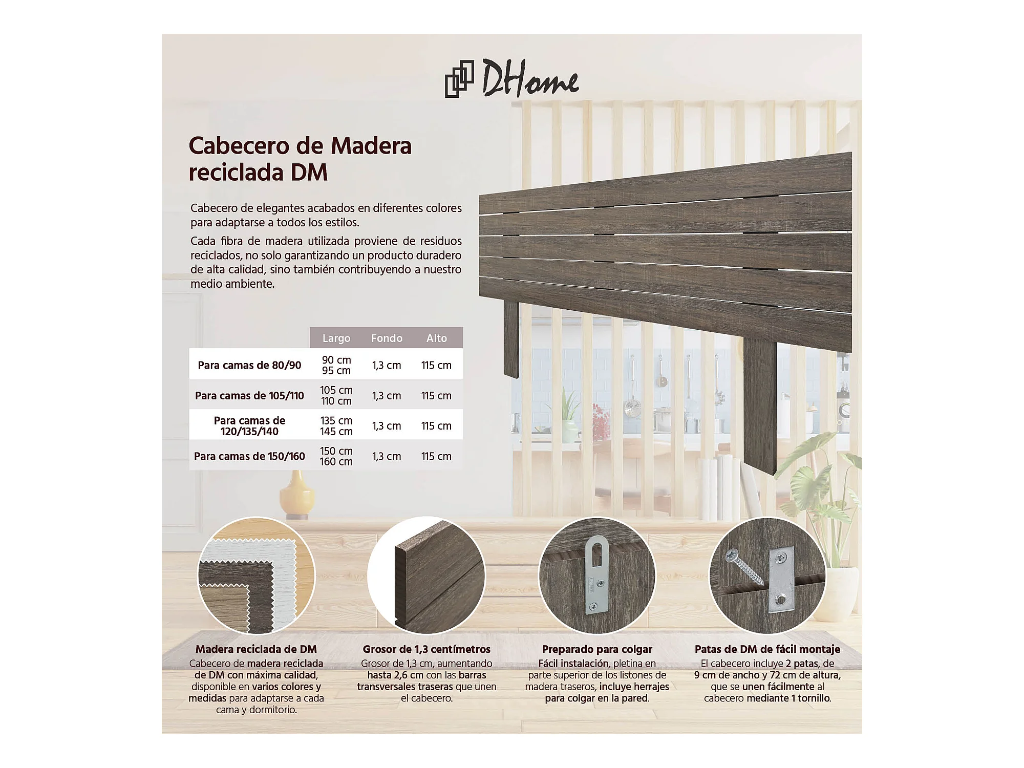 DHOME Tête de Lit Bois Recyclé Dm Style Japonais avec Pieds 110x115cm Lits 110 - Chêne Amazone