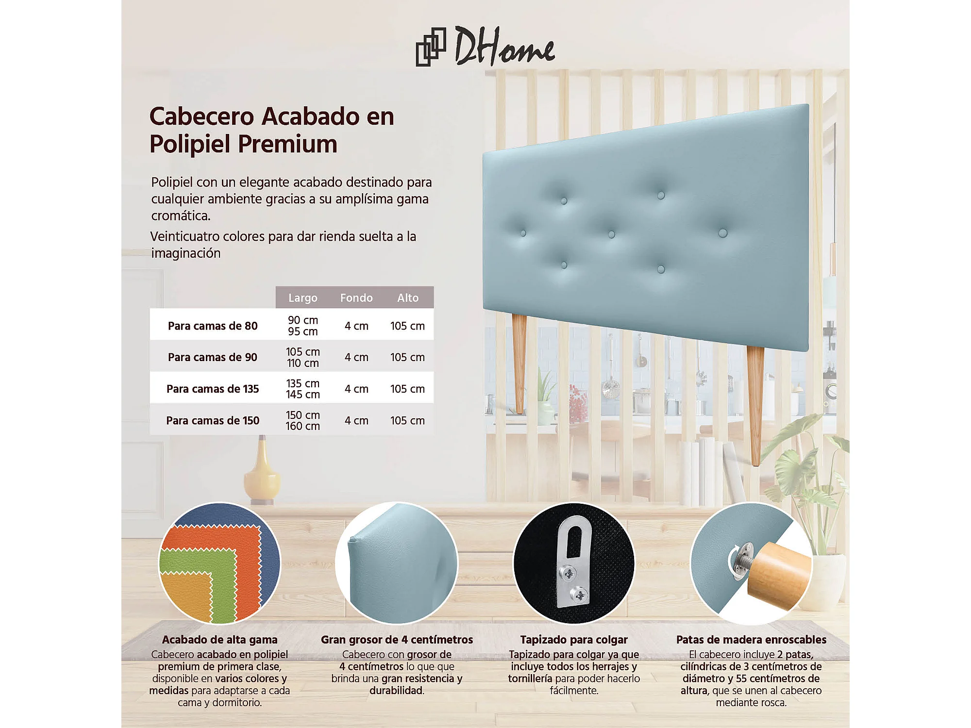 DHOME Tête de lit en simili cuir avec 3 rangées de boutons entrelacés Tête de lit rembourrée pour lit de luxe (Ciel, 90cm)