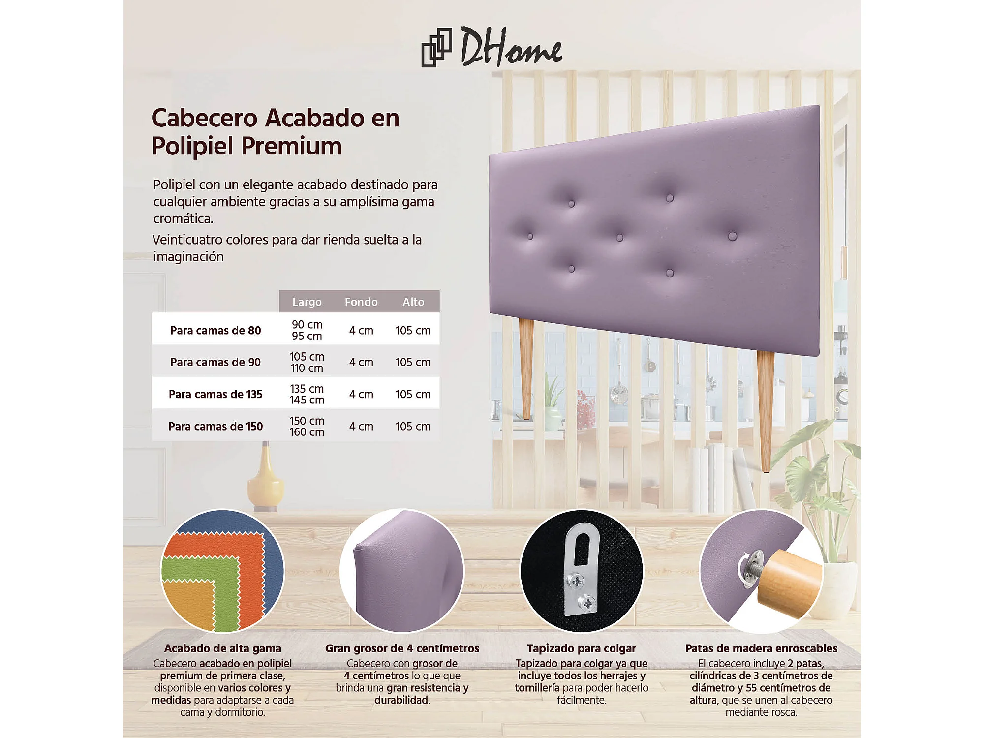 DHOME Tête de lit en simili cuir avec 3 rangées de boutons entrelacés Tête de lit rembourrée pour lit de luxe (Lilas, 110cm)