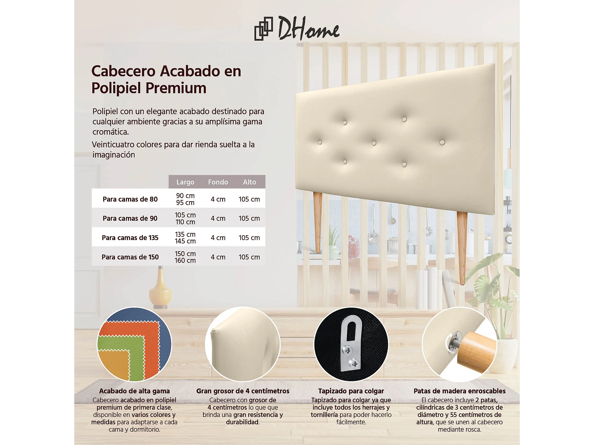 DHOME Tête de lit en simili cuir avec 3 rangées de boutons entrelacés Tête de lit rembourrée pour lit de luxe (Vanille, 95cm)
