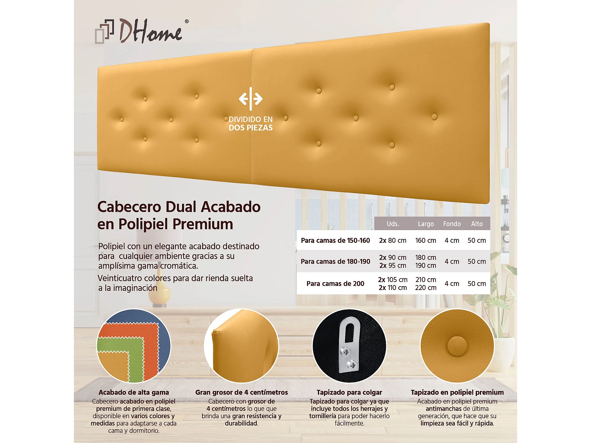 DHOME Tête de Lit en Similicuir avec 3 Rangées de Boutons Entrelacées Tête de Lit Rembourrée de Luxe (Moutarde, 180cm (2 pièces))