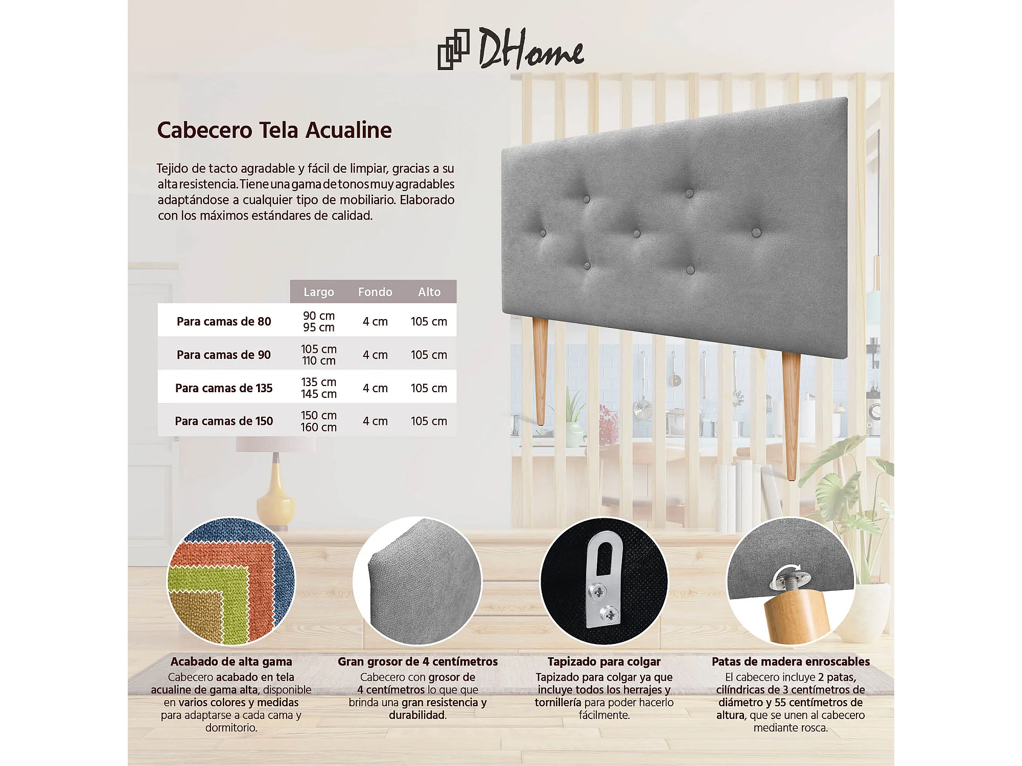 DHOME Tête de lit tapissée en tissu Aqualine composée de panneaux de lit autocollants interchangeables pour chambre de luxe (Gris perle, 95 cm)
