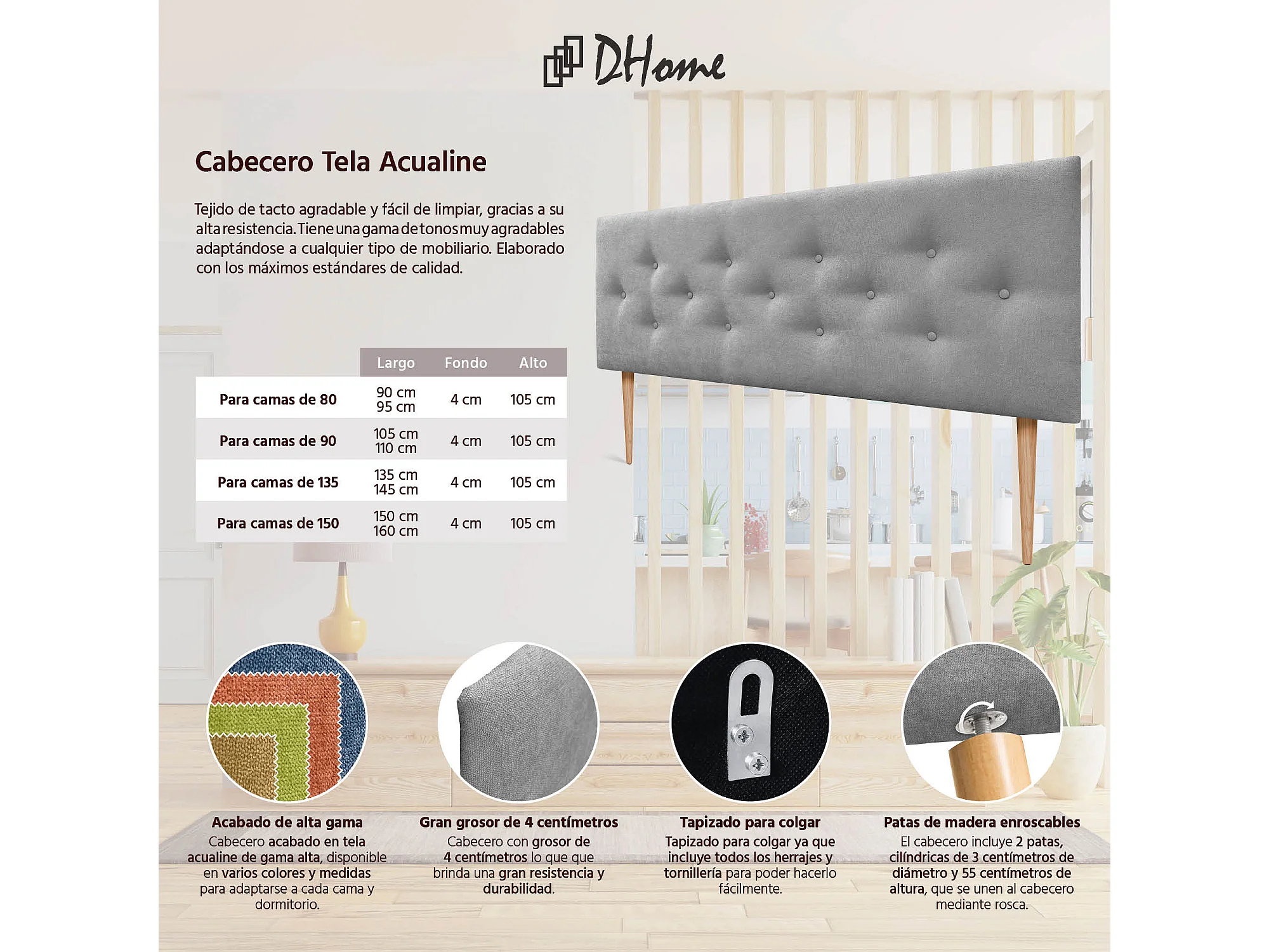 DHOME Tête de lit tapissée en tissu Aqualine composée de panneaux de lit autocollants interchangeables pour chambre de luxe (Gris cendré, 150 cm)