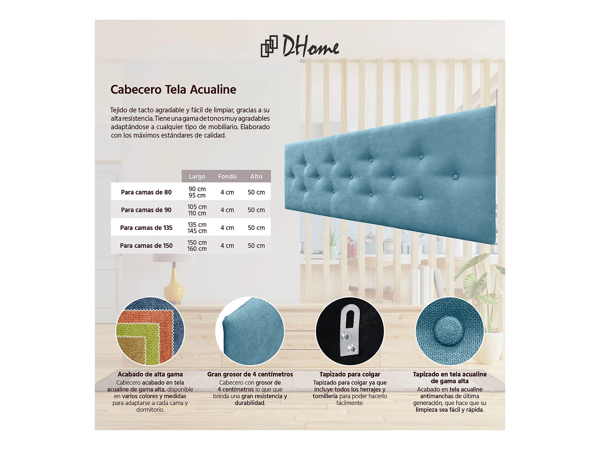 DHOME Tête de Lit en Tissu ACUALINE avec 3 Rangées Entrelacées de Boutons Tête de Lit Capitonnée de Luxe(Turquoise, 150cm)