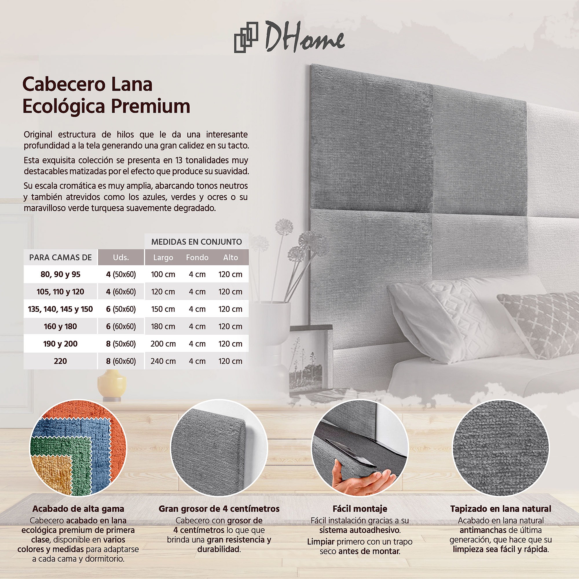 DHOME Tête de Lit Rembourrée en Laine Écologique Composée de Panneaux Autocollants Interchangeables Chambre de Luxe Rembourrée (Gris, 80 cm)