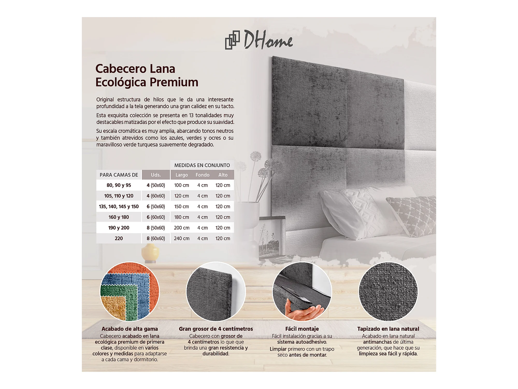 DHOME Tête de Lit Laine Naturelle avec Boutons 105x105cm avec Pieds de Lit 105 - Gris Foncé