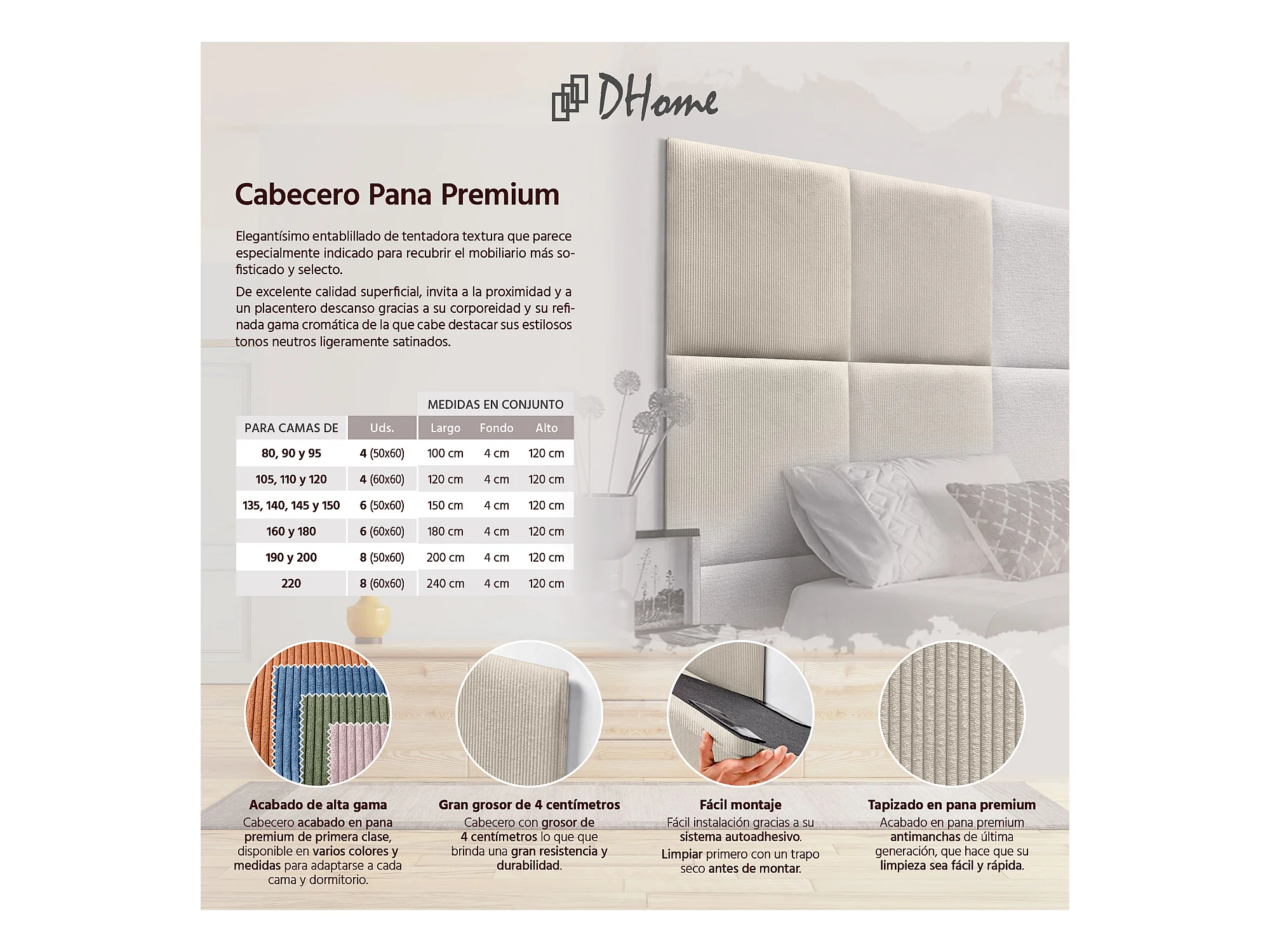 DHOME Tête de lit rembourrée en velours côtelé de qualité supérieure composée de panneaux autocollants interchangeables (beige, 145 cm)