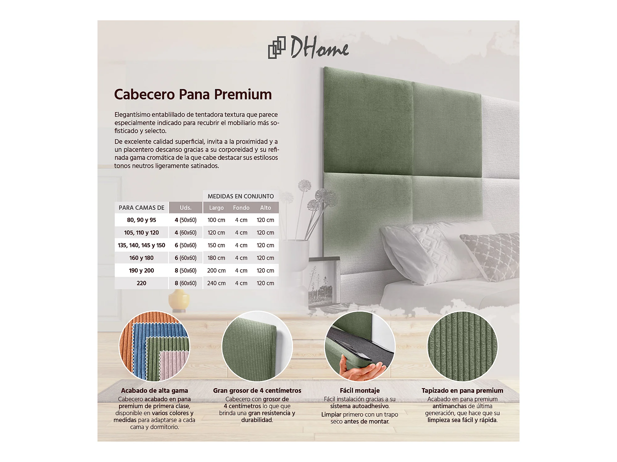 DHOME Tête de lit rembourrée en velours côtelé de qualité supérieure composée de panneaux autocollants interchangeables (vert jungle, 110 cm)