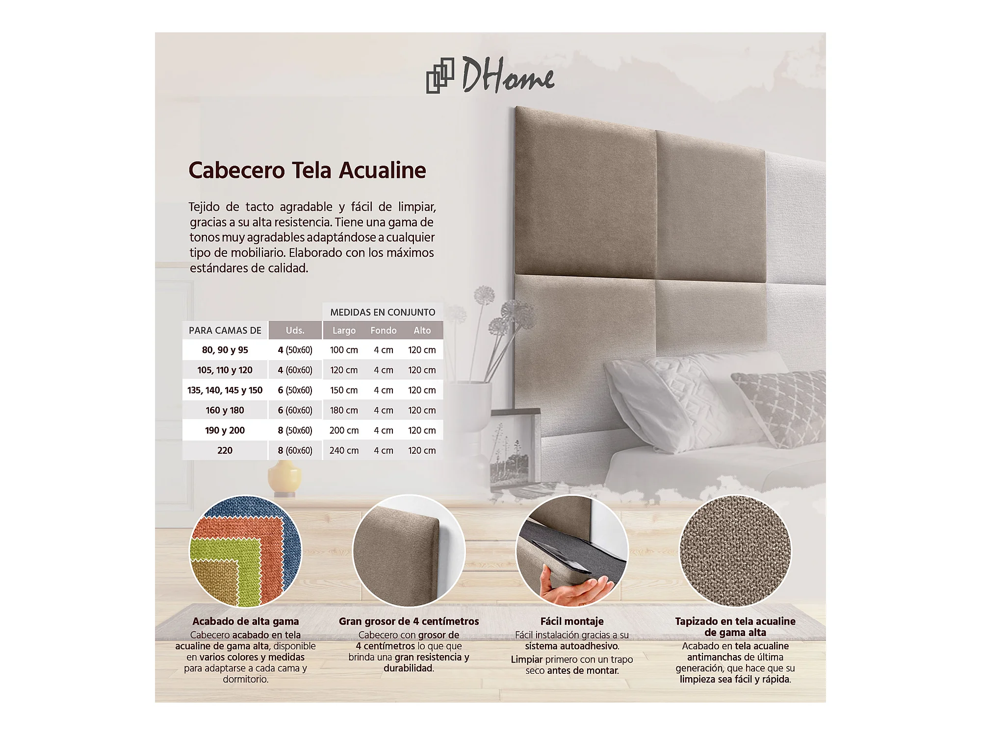 DHOME Tête de lit tapissée en tissu Aqualine composée de panneaux de lit autocollants interchangeables pour chambre de luxe (Terre, 160 cm)