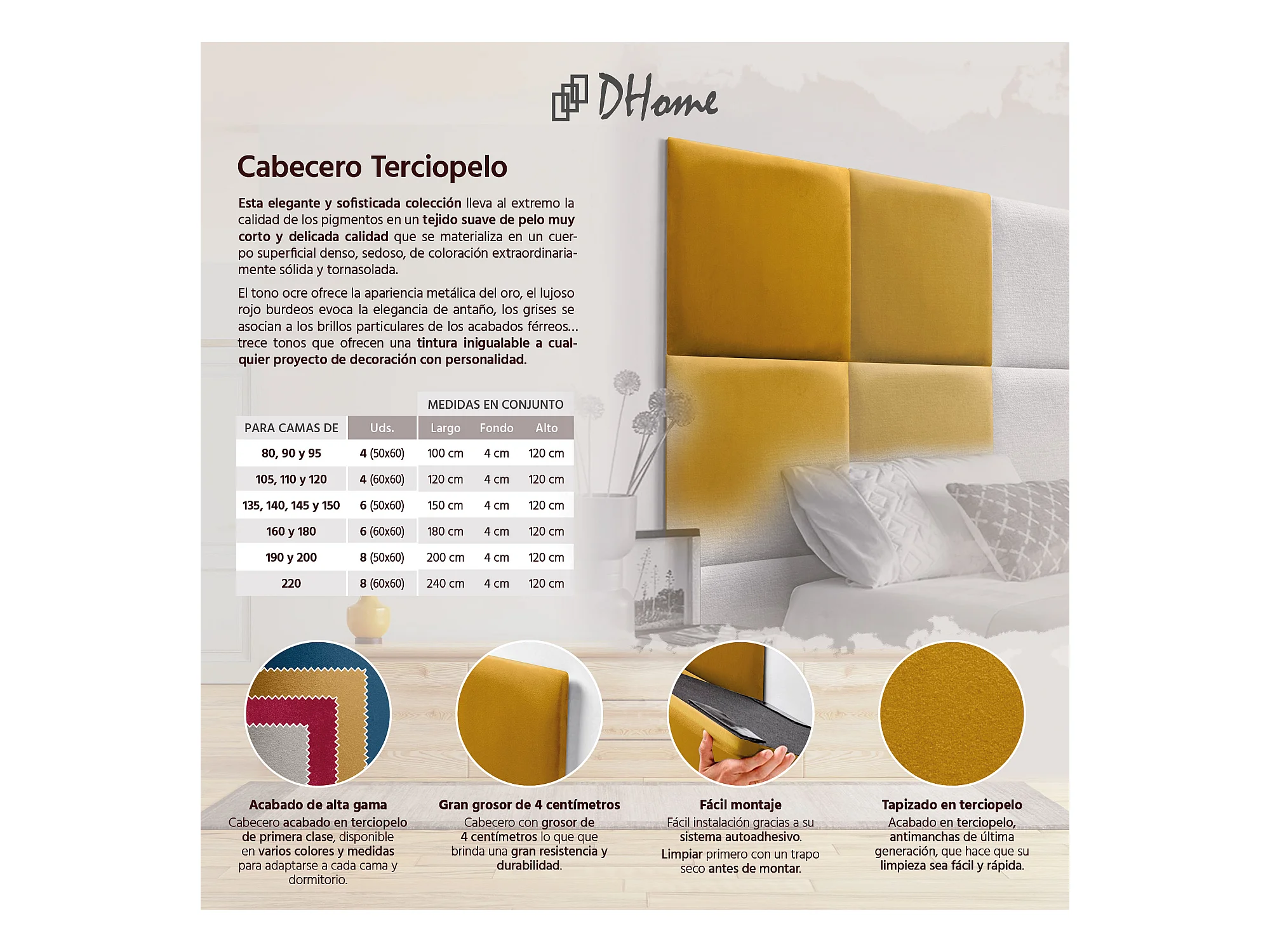 DHOME Tête delit Tapissée en velours de qualité supérieure composée de panneaux autocollants interchangeables pour chambre (moutarde, 145 cm)