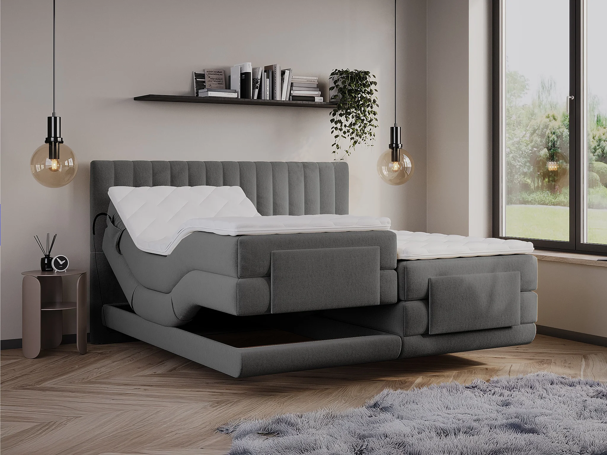 Ensemble complet boxspring tête de lit coutures verticales + sommiers relaxation électrique + matelas + surmatelas - 2 x 80 x 200 cm - Velours - Anthracite - DONISI de PALACIO