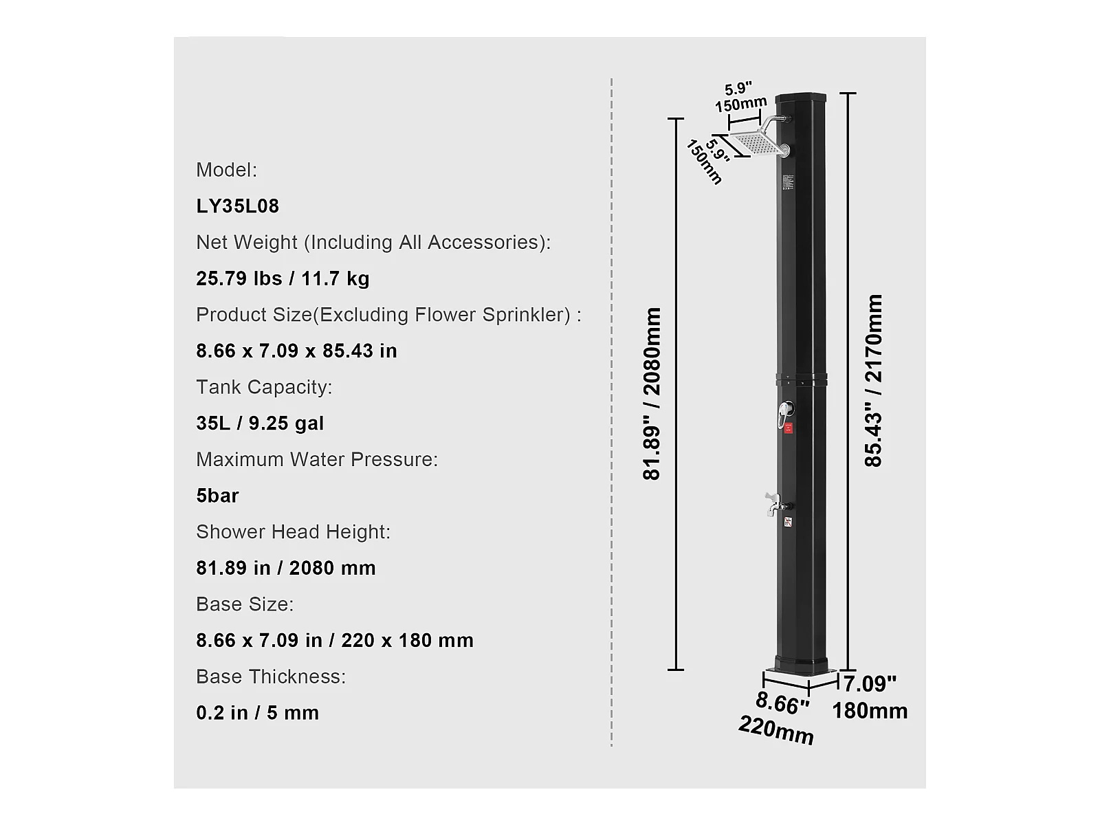 Douche solaire de jardin Noir 215 cm 8 L WVGQ5762