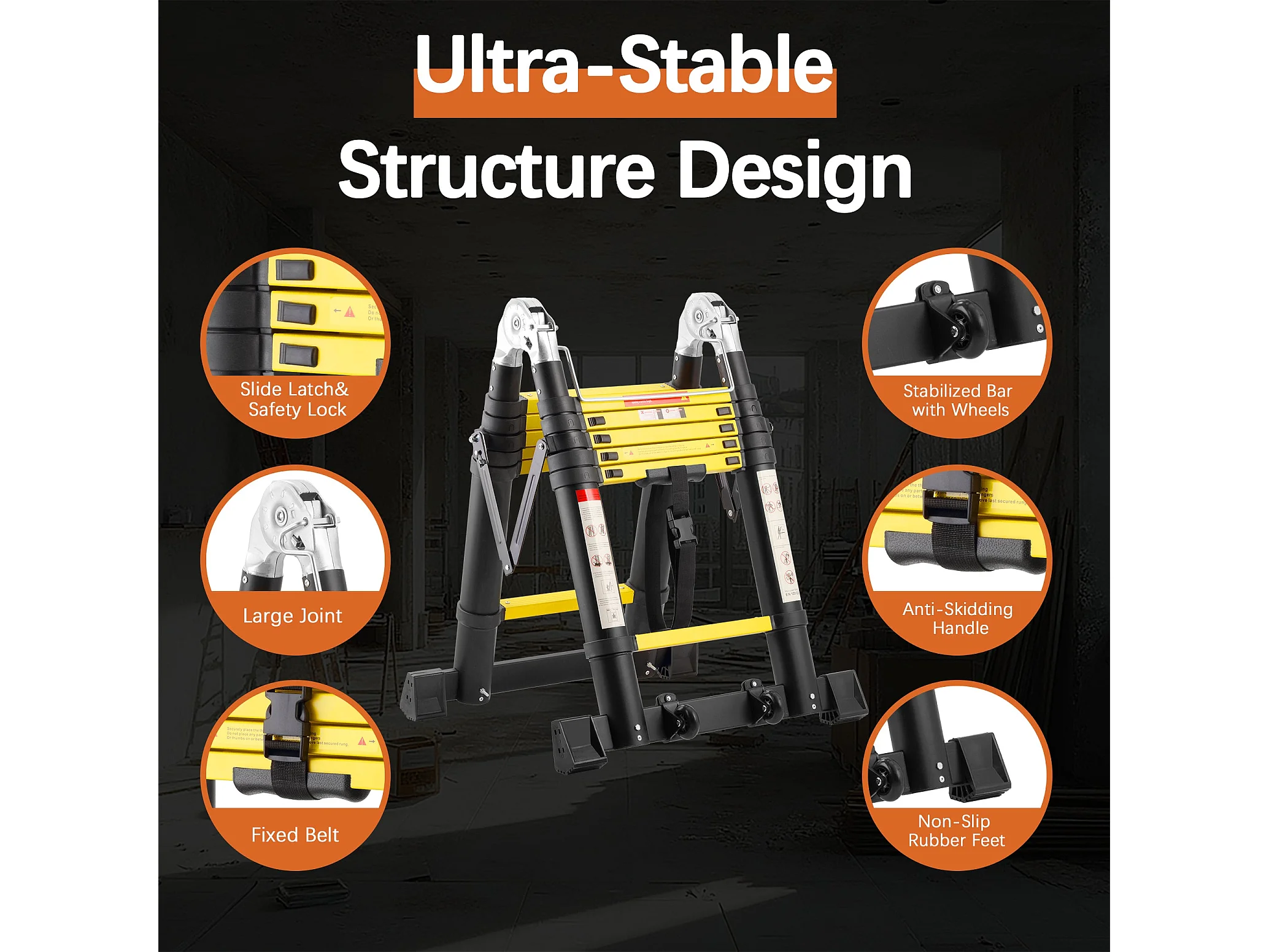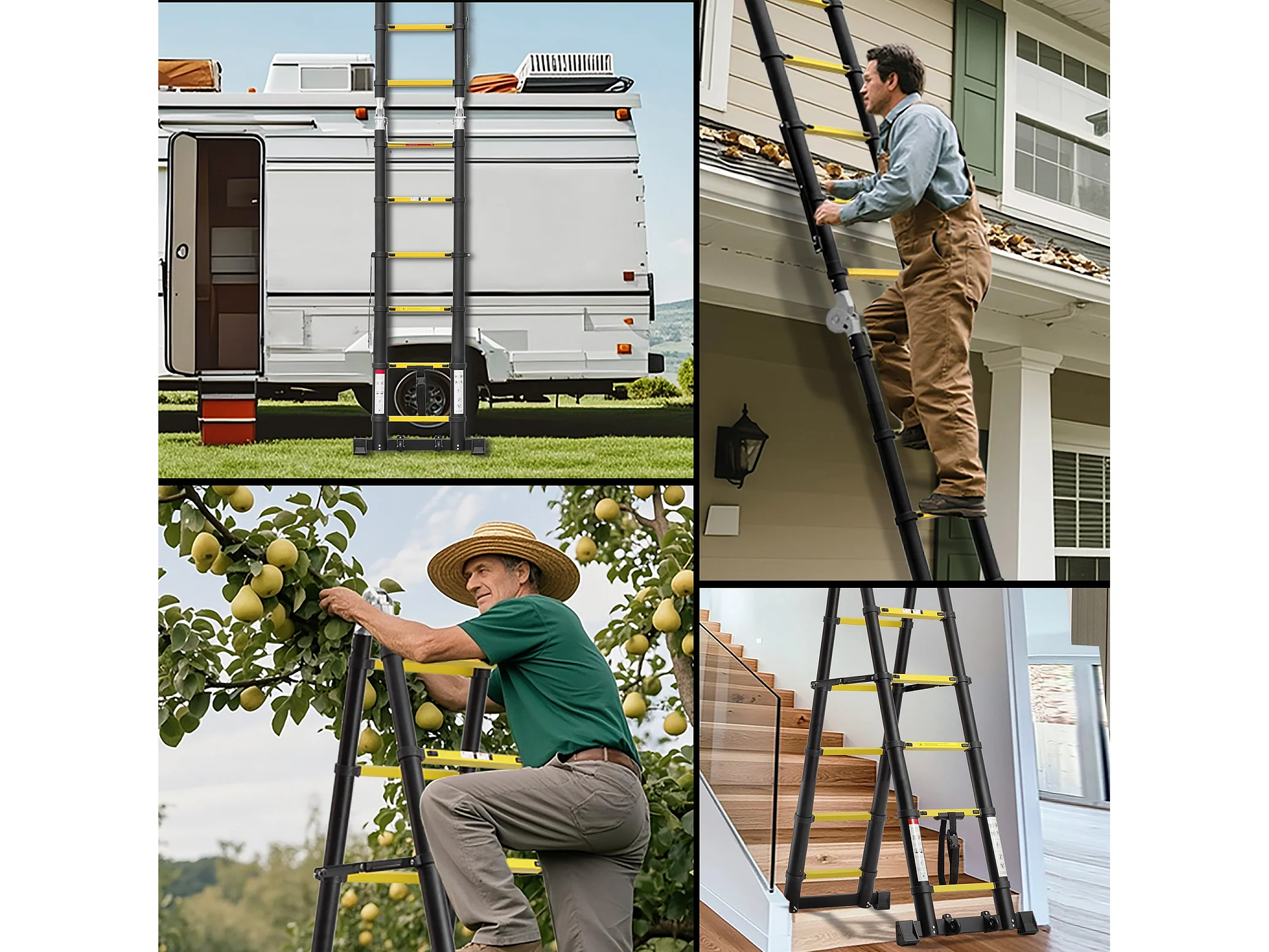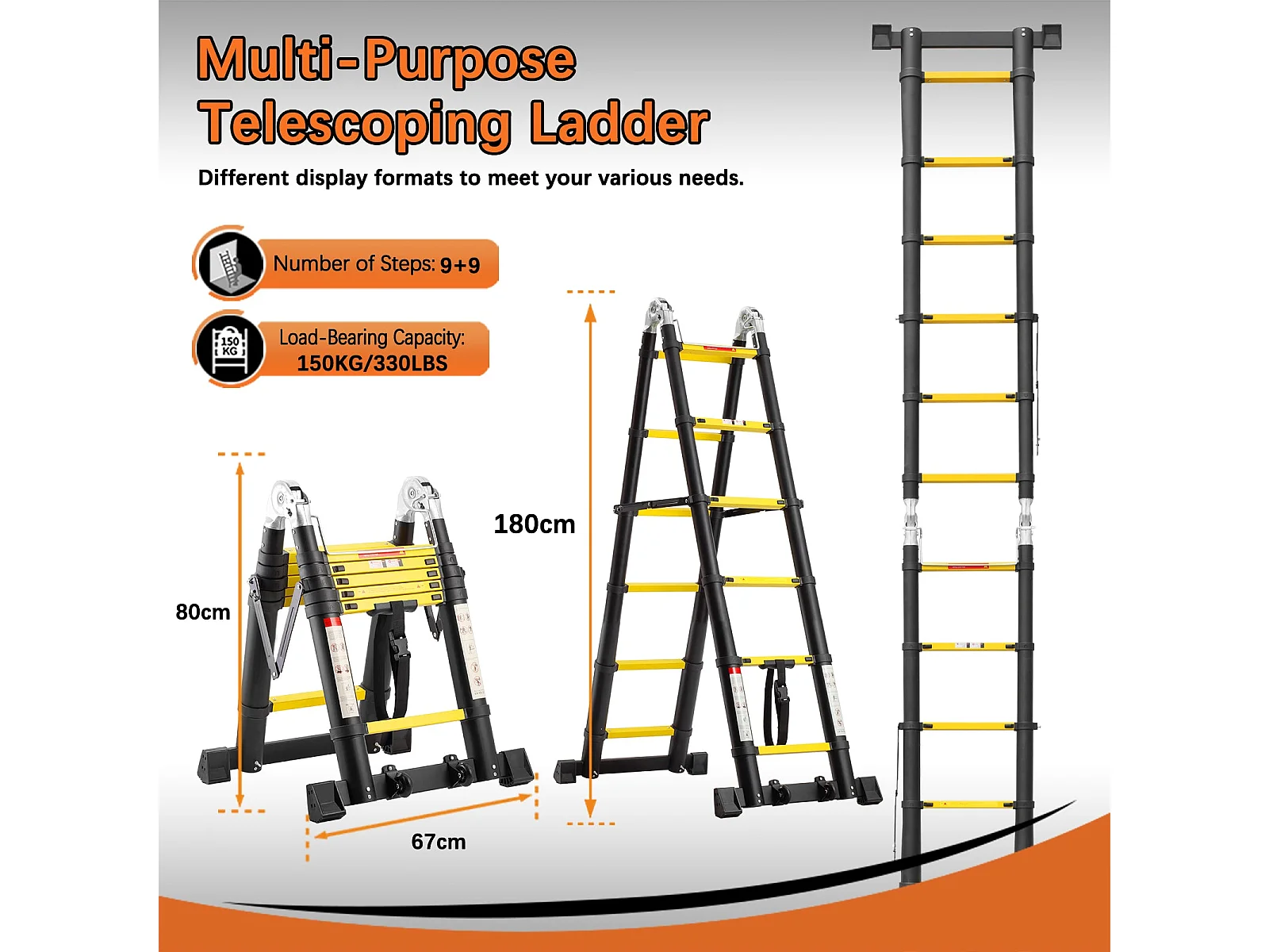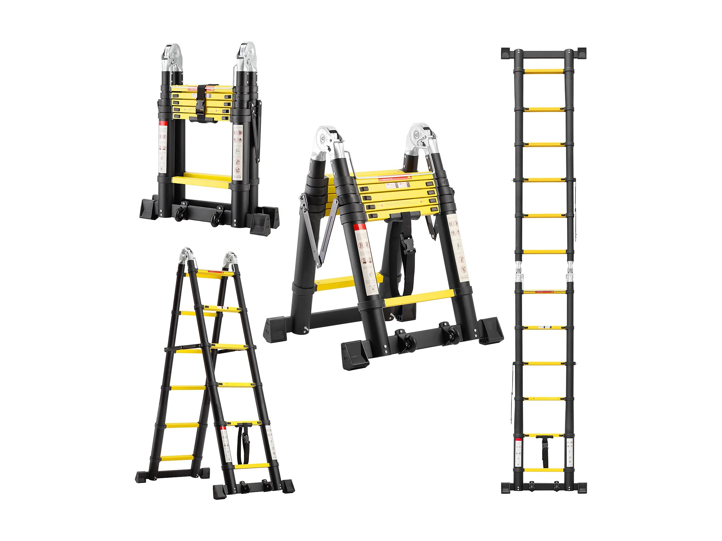 Échelle télescopique de 3.8 m (1,9+1,9), échelle pliante avec poulies en bas, capacité de charge de 150 kg, noir