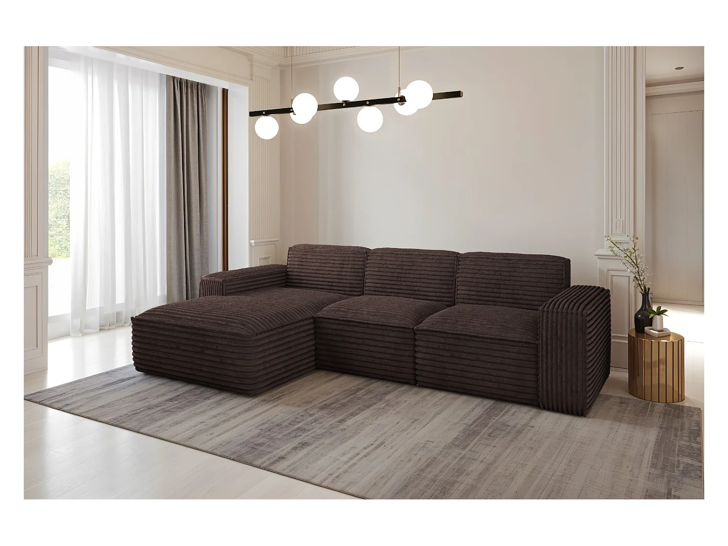 Canapé d'angle gauche design matelassé tissu doux brillant marron et pied noir Kazane 275cm