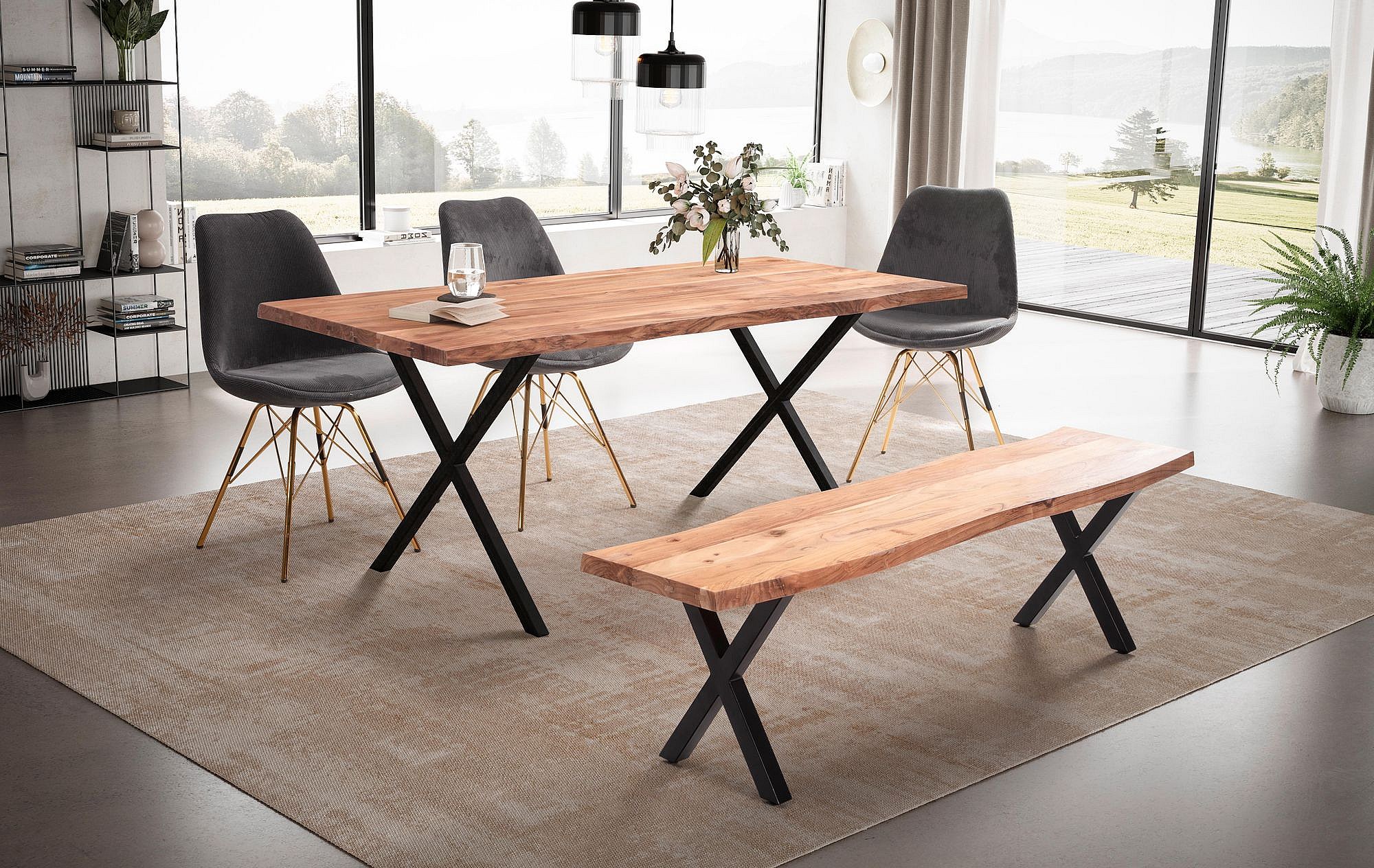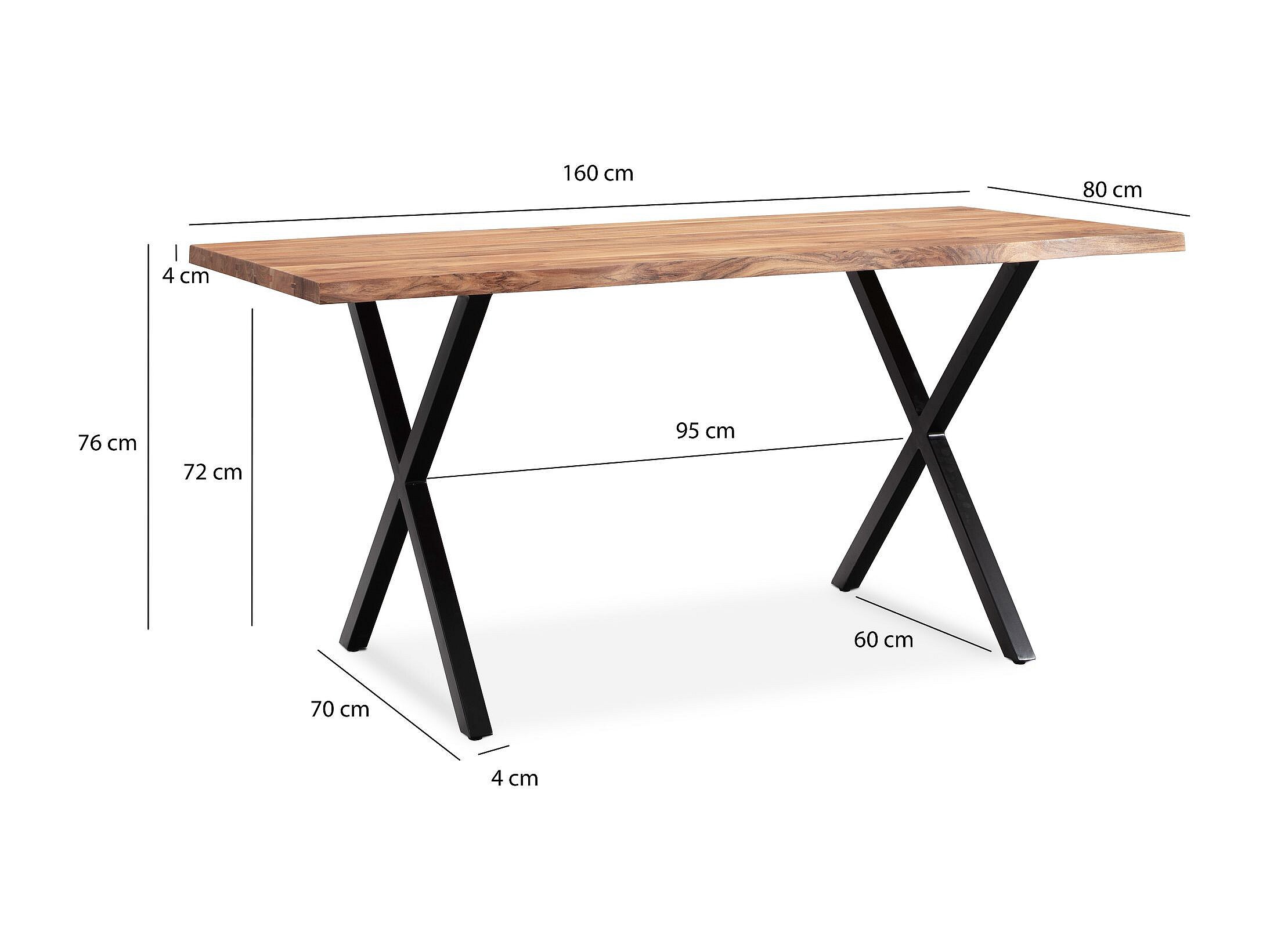 Eettafel 180x90x76 cm in massief acaciahout en metaal, keukentafel met natuurlijke randen, rechthoekige eettafel met x poten in zwart