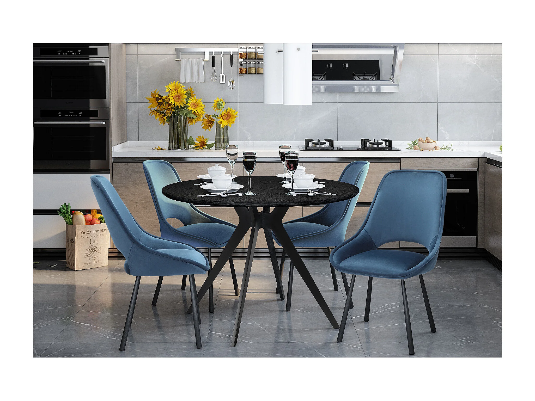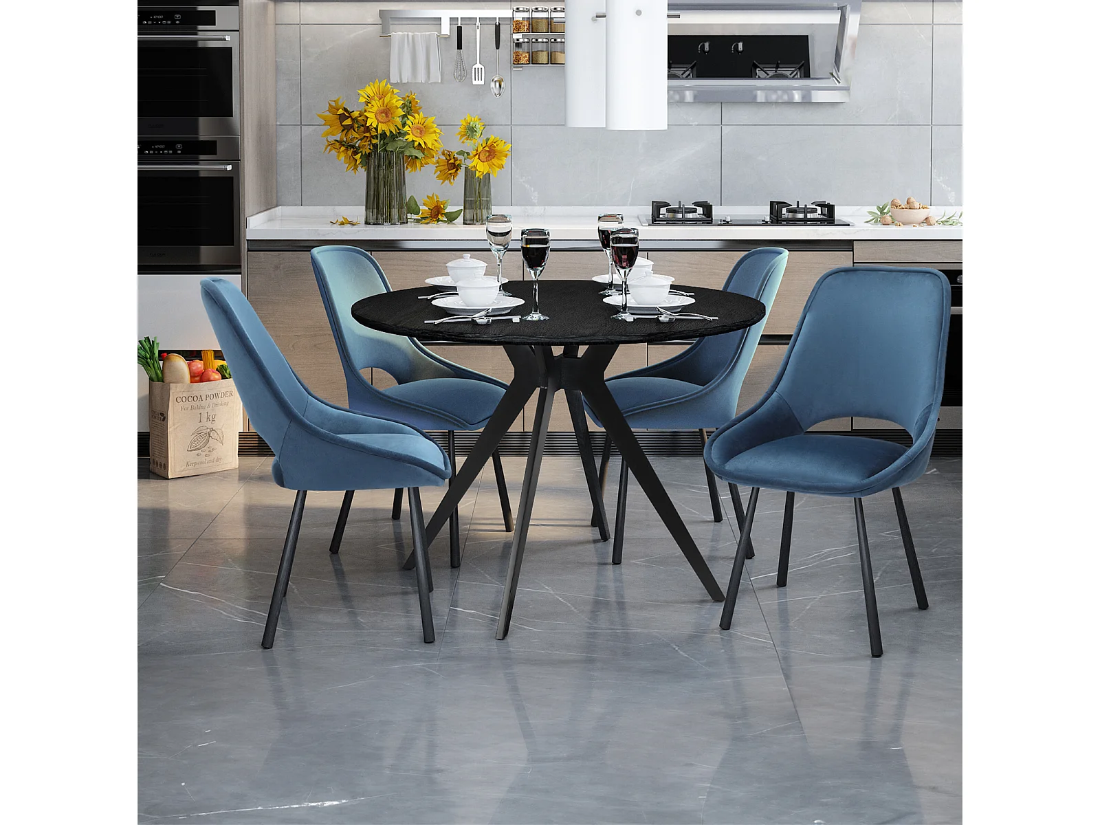 Eliza | Chaise de salle à manger en velours bleu foncé avec pieds en métal noir - Lot de 2