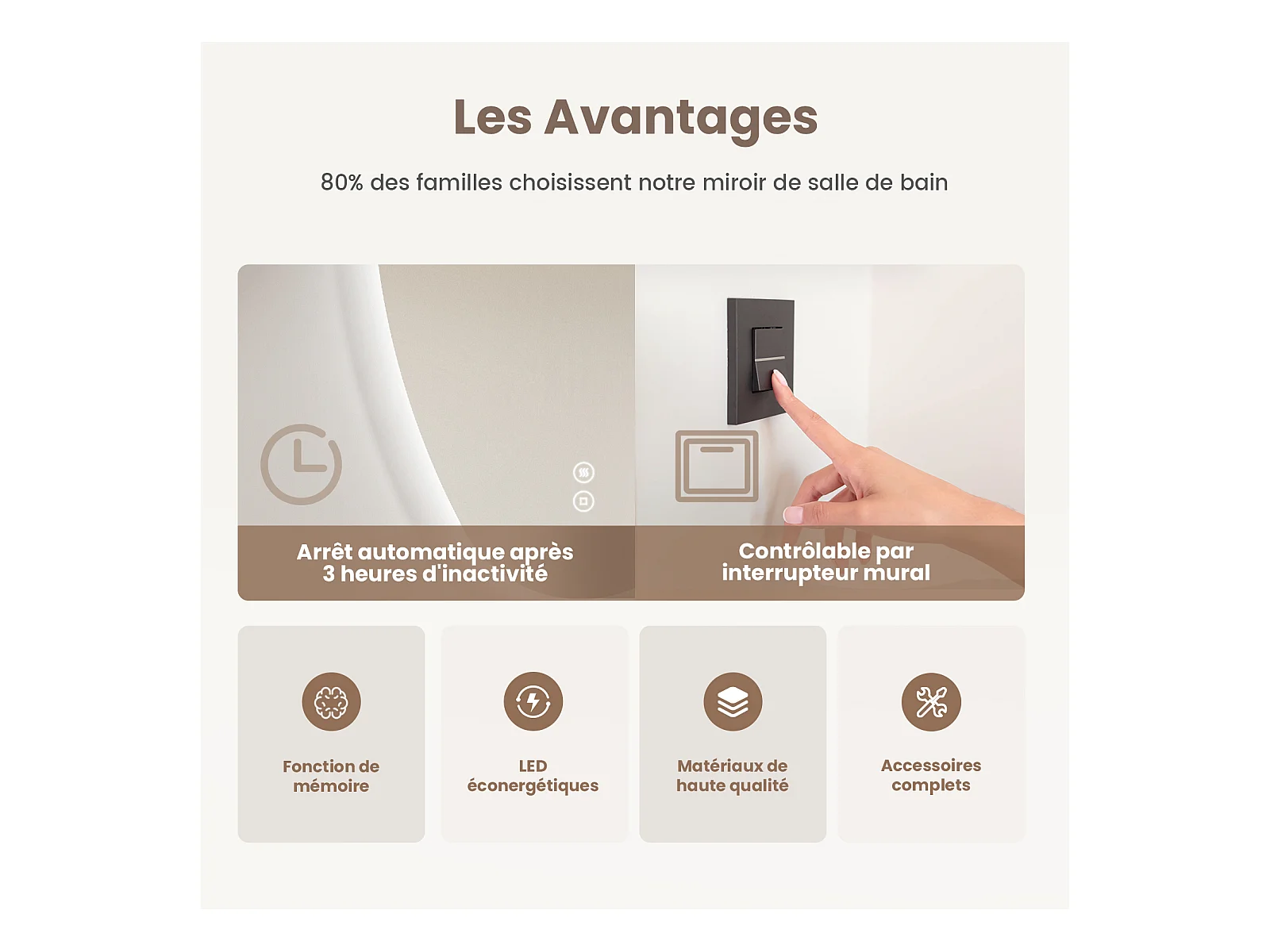 Miroir salle de bain led 60x90cm miroir avec bluetooth tricolore anti-buée 90x60cm
