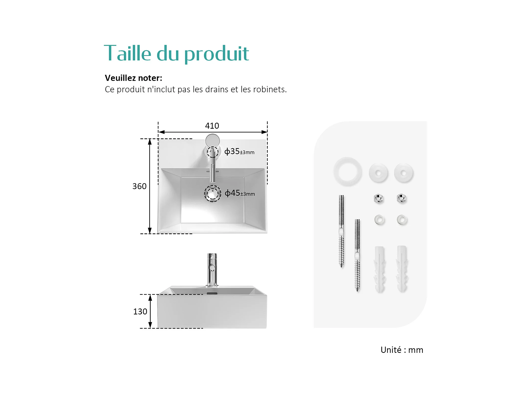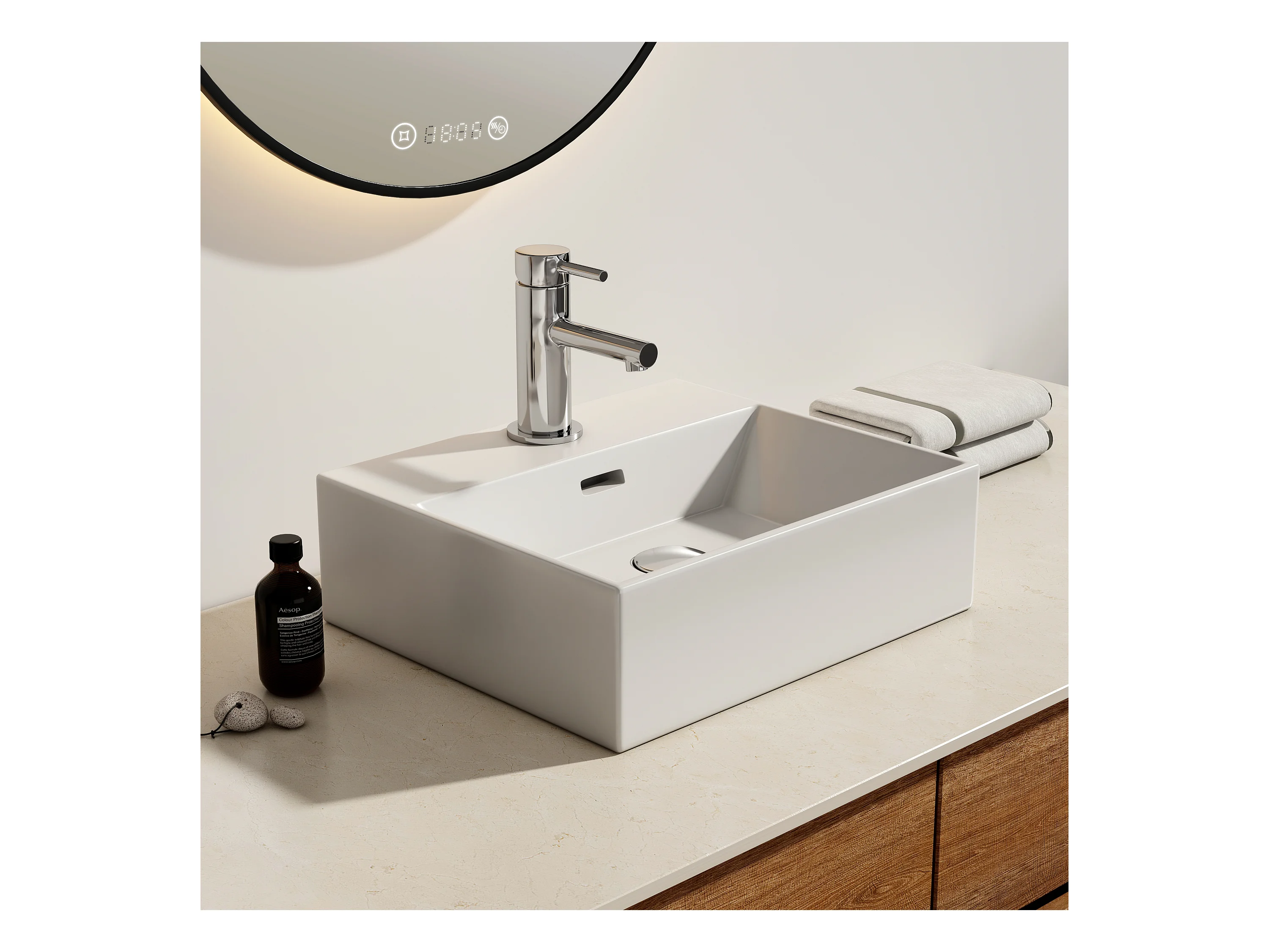 EMKE Vasque à Poser en céramique 41,5×36×13cm, Lavabo rectangulaire avec robinet trou prépercé, Lavabo à poser blanc brillant
