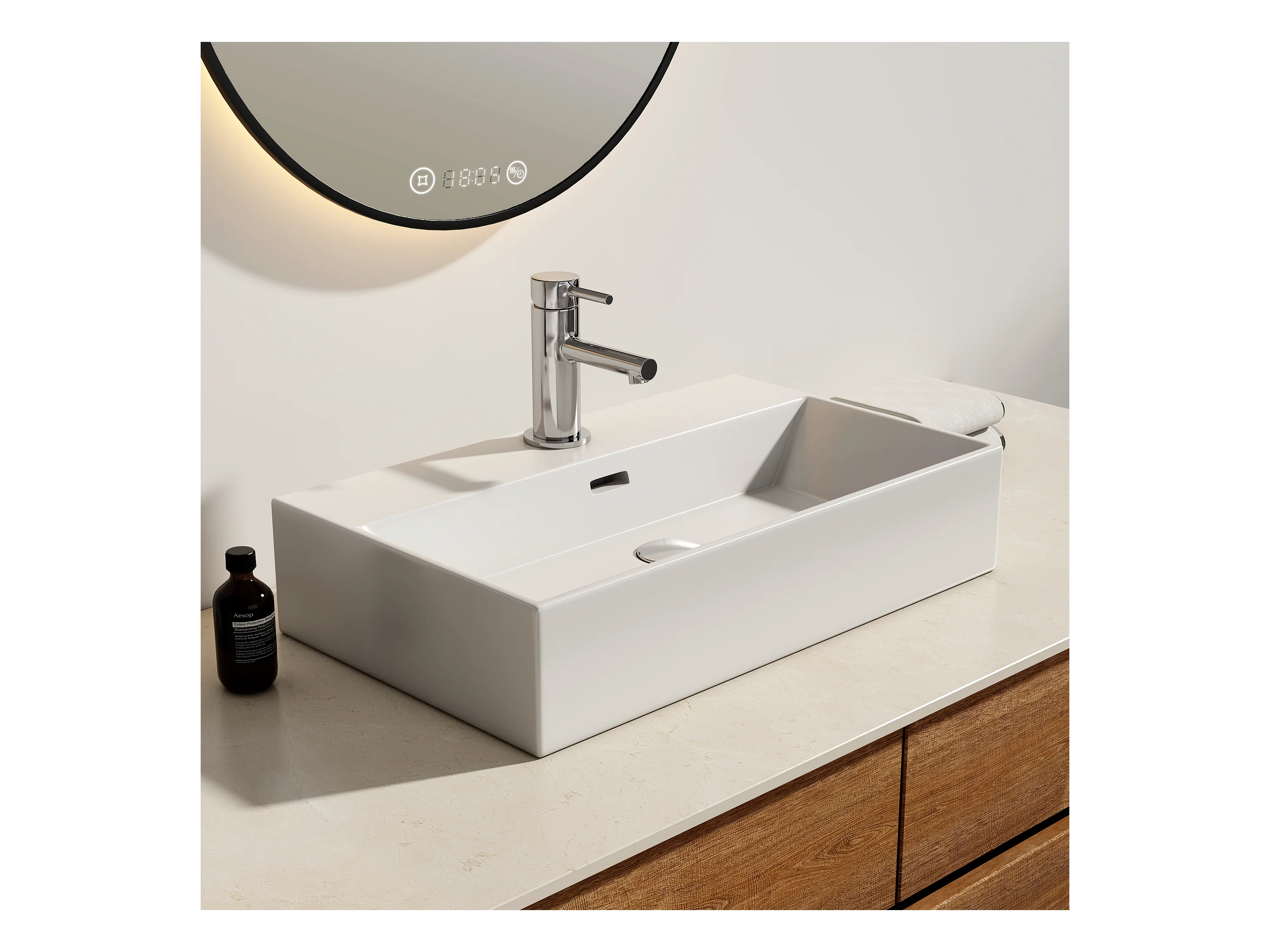EMKE Vasque à Poser en céramique 60×36×13cm, Lavabo rectangulaire avec robinet trou prépercé, Lavabo à poser blanc brillant
