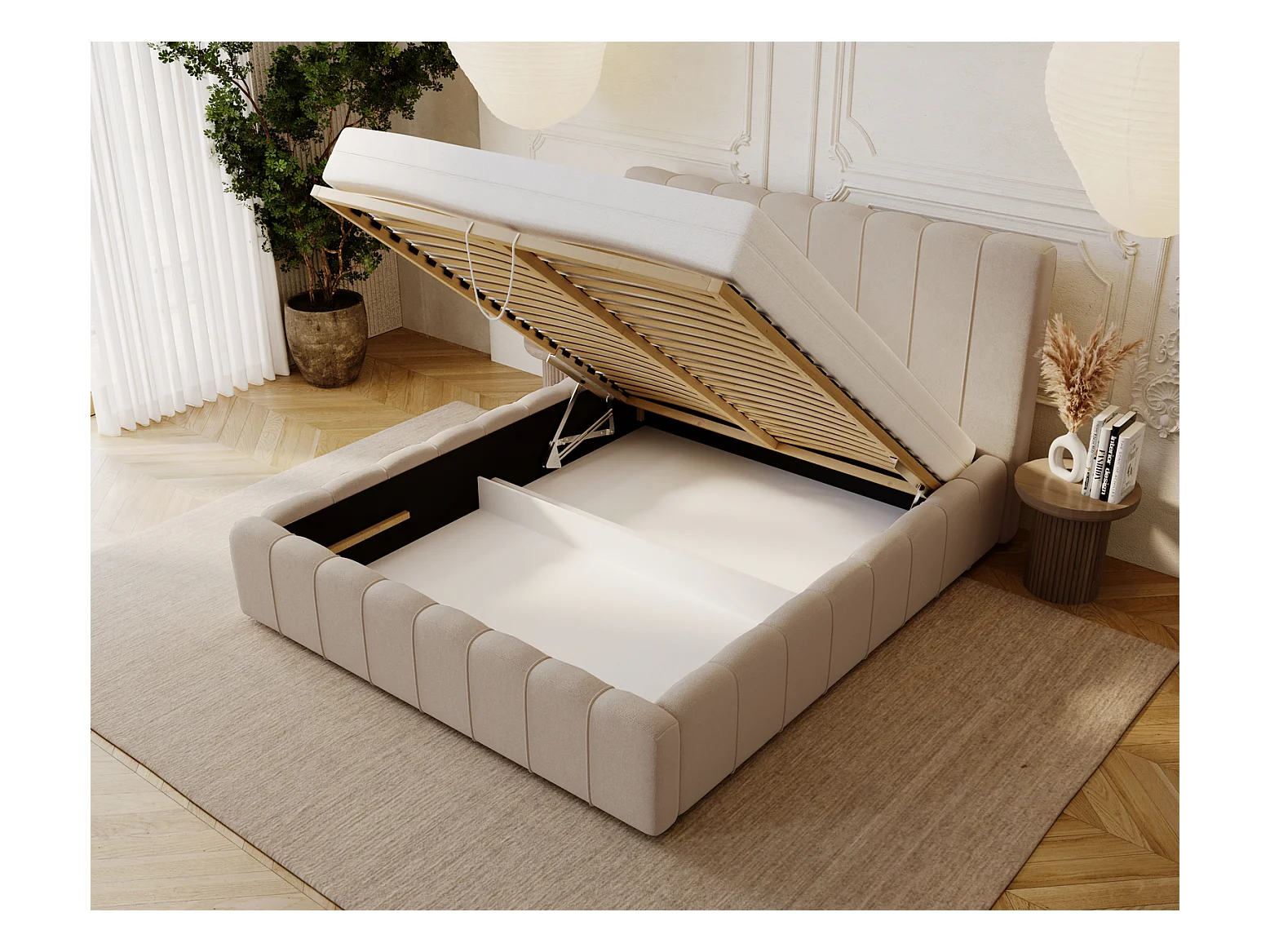 Lit coffre en tissu beige