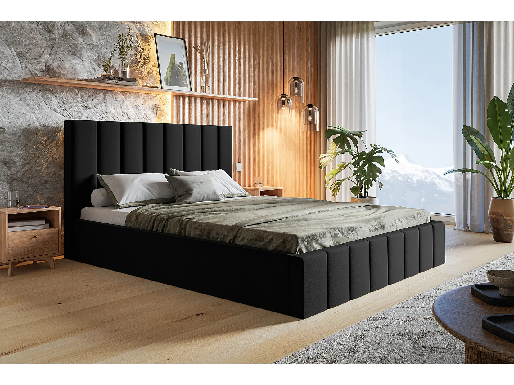 Emporius Lit avec Rangment 160 x 200 cm Moris - Tissu Velours & Sommier, Lit adulte 160x200 cm - Velvet Noir (Jasmine 100)