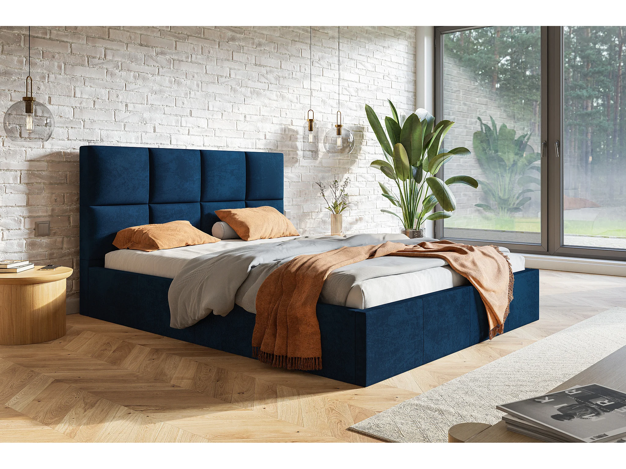 Lit rembourré 160 x 200 Fado - Lit adulte avec rangment, tête de lit - tissu velours - Bleu (Kronos 09)