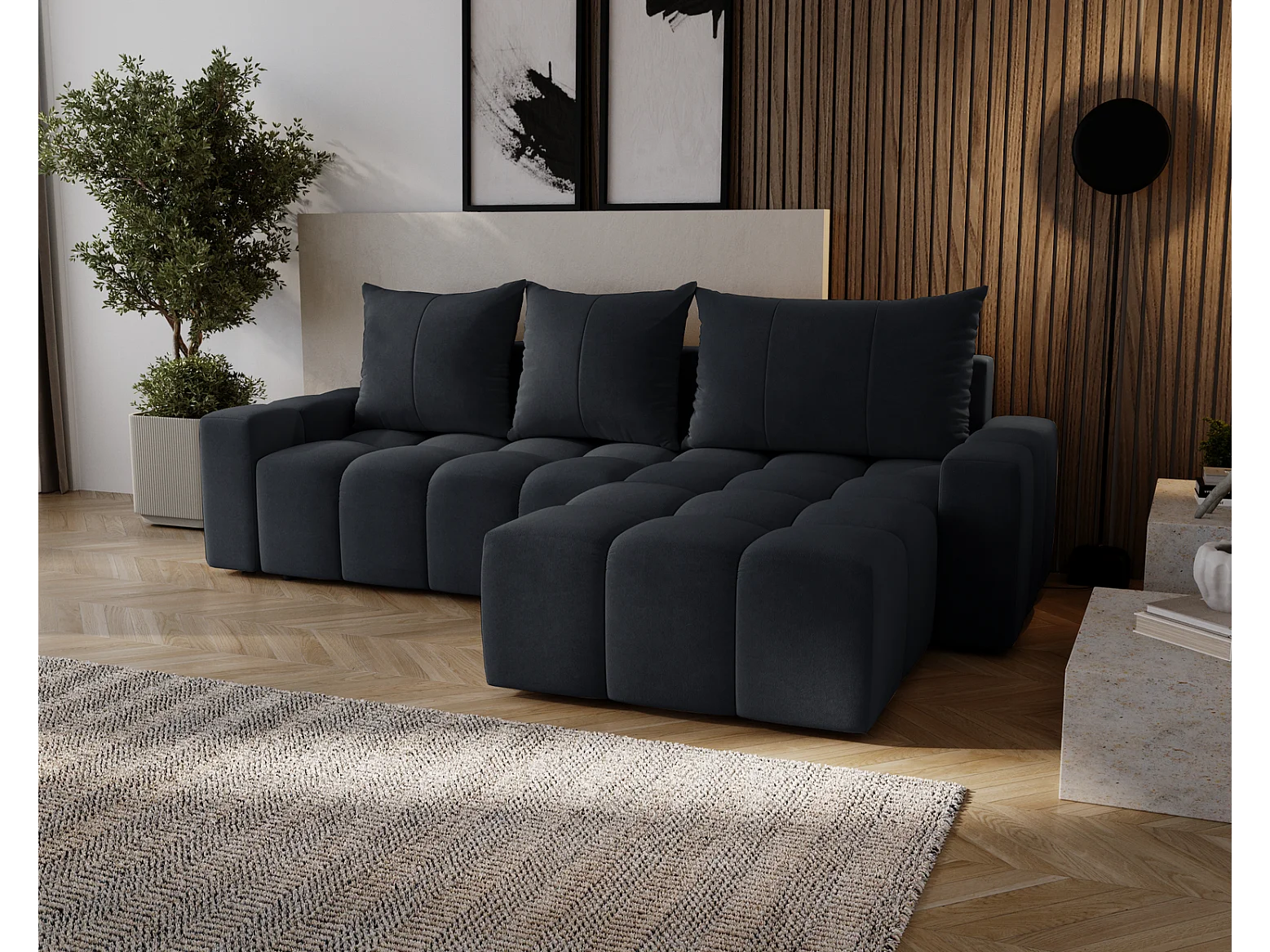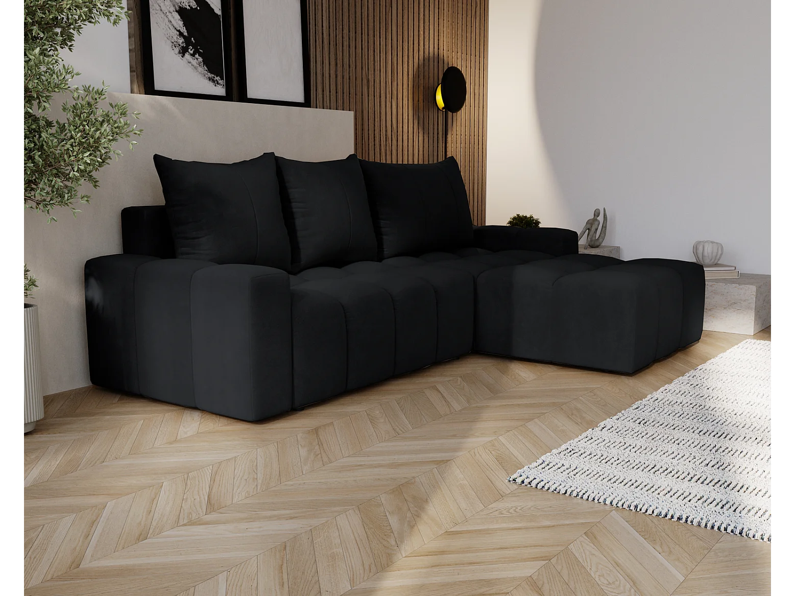 Emporius Wilson Canapé d'angle - Tissu Velours, Canapé 255 cm Convertible, Droite - Noir (Amor Velvet 4322)