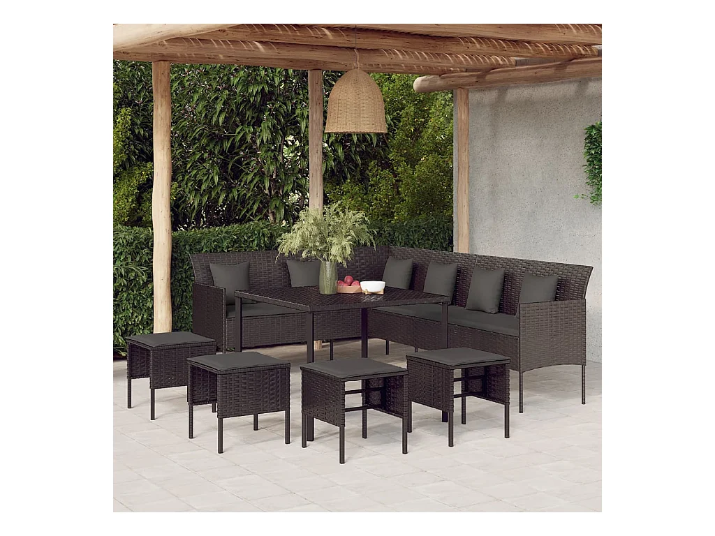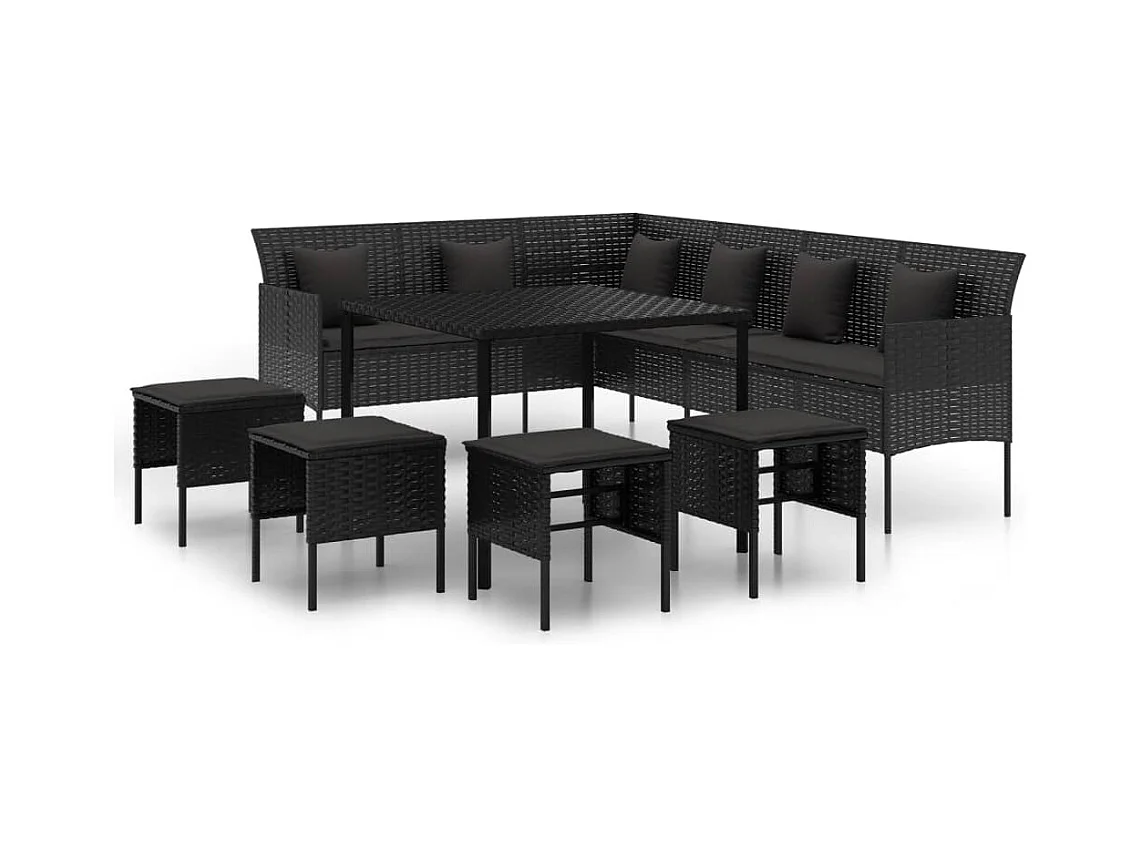 Ensemble à dîner de jardin et coussins 6 pièces noir résine tressée