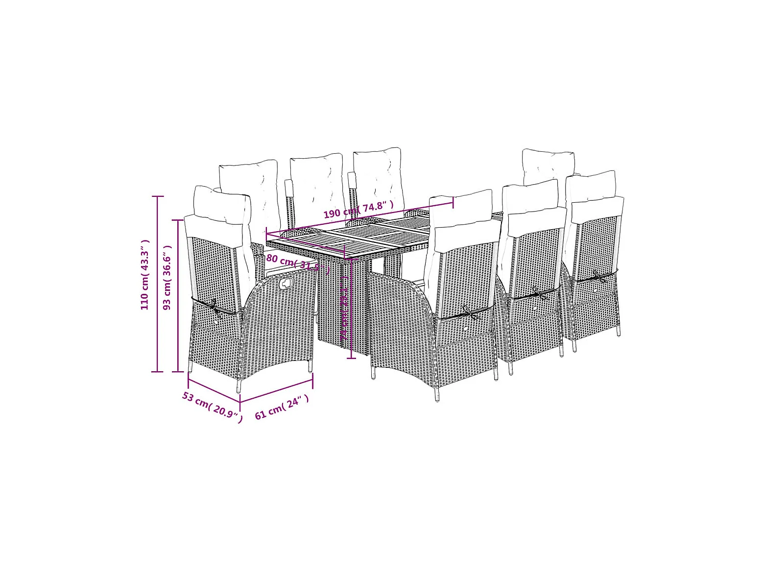 Ensemble à manger de jardin 9 pcs coussins gris résine tressée