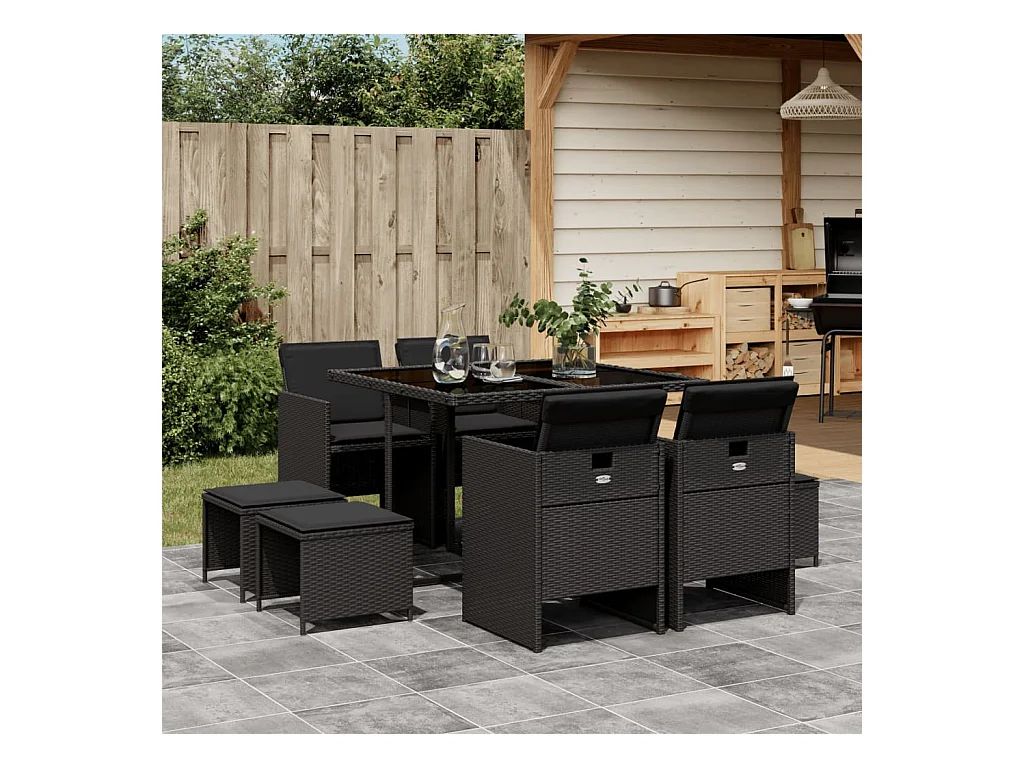 Ensemble à manger de jardin 9 pièces coussins noir résine tressée