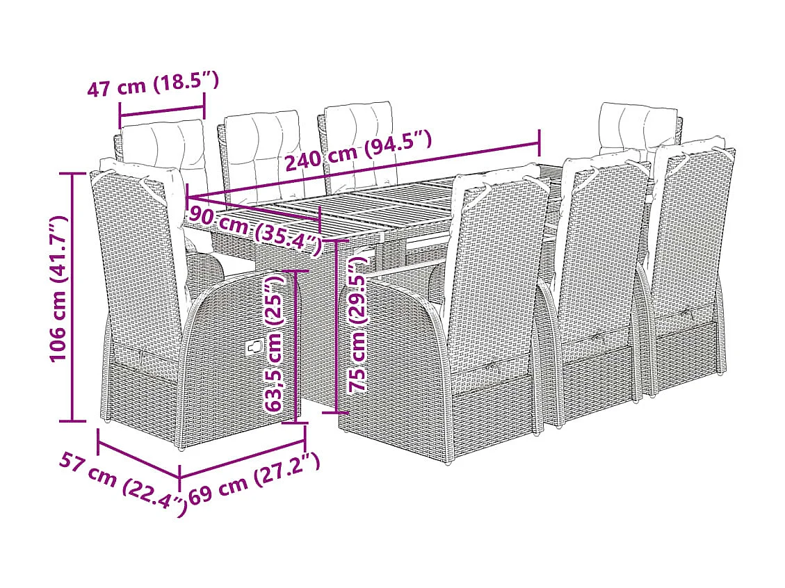 Ensemble à manger de jardin 9 pièces coussins noir résine tressée