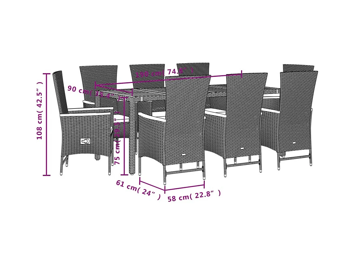 Ensemble à manger de jardin et coussins 9 pièces noir rotin verre