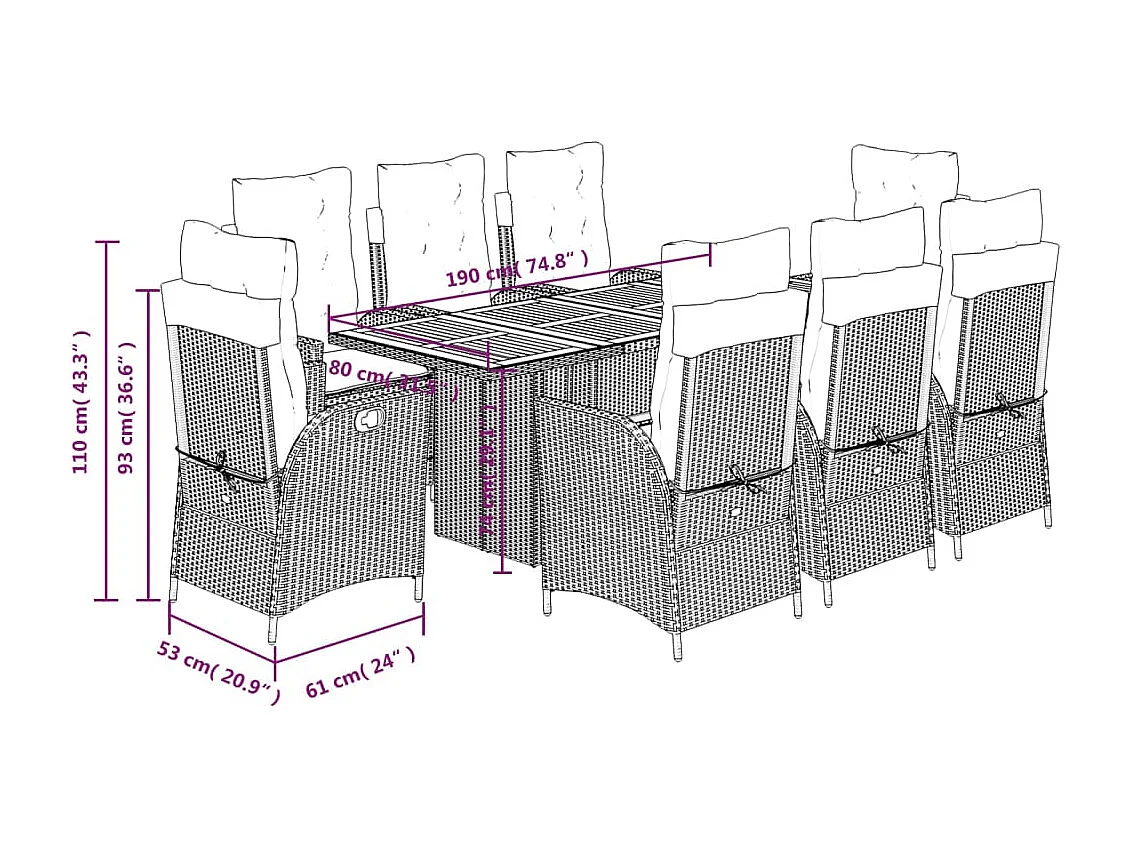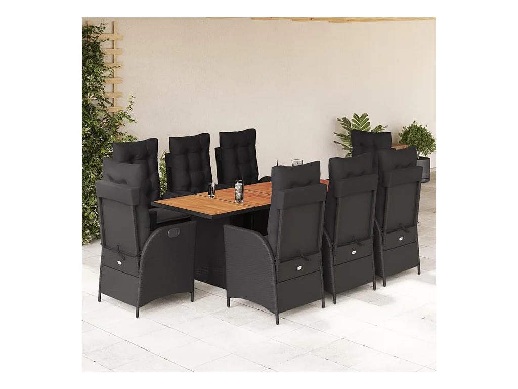 Ensemble à manger de jardin 9pcs coussins noir résine tressée