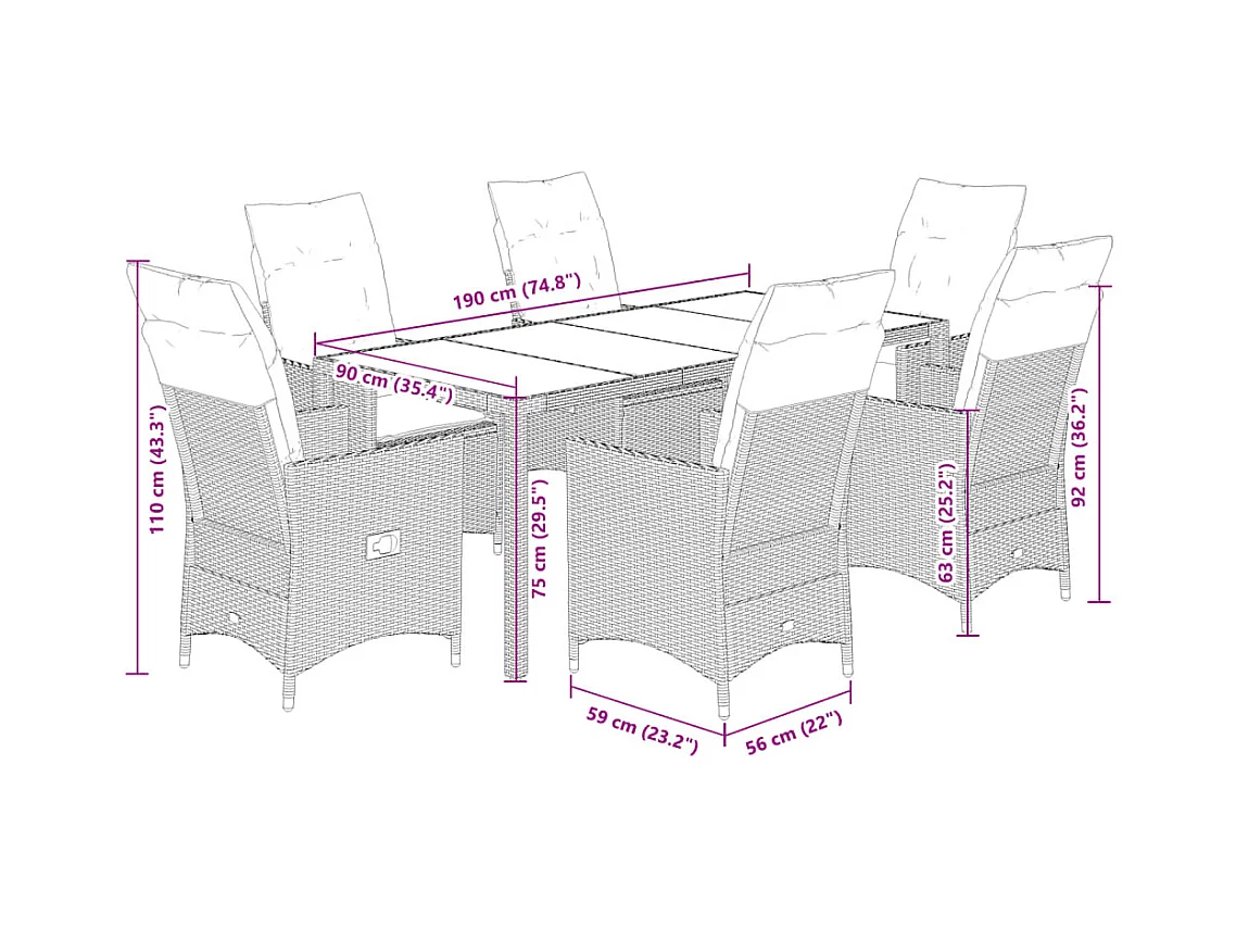 Ensemble à manger de jardin coussins 7pcs Noir Résine tressée