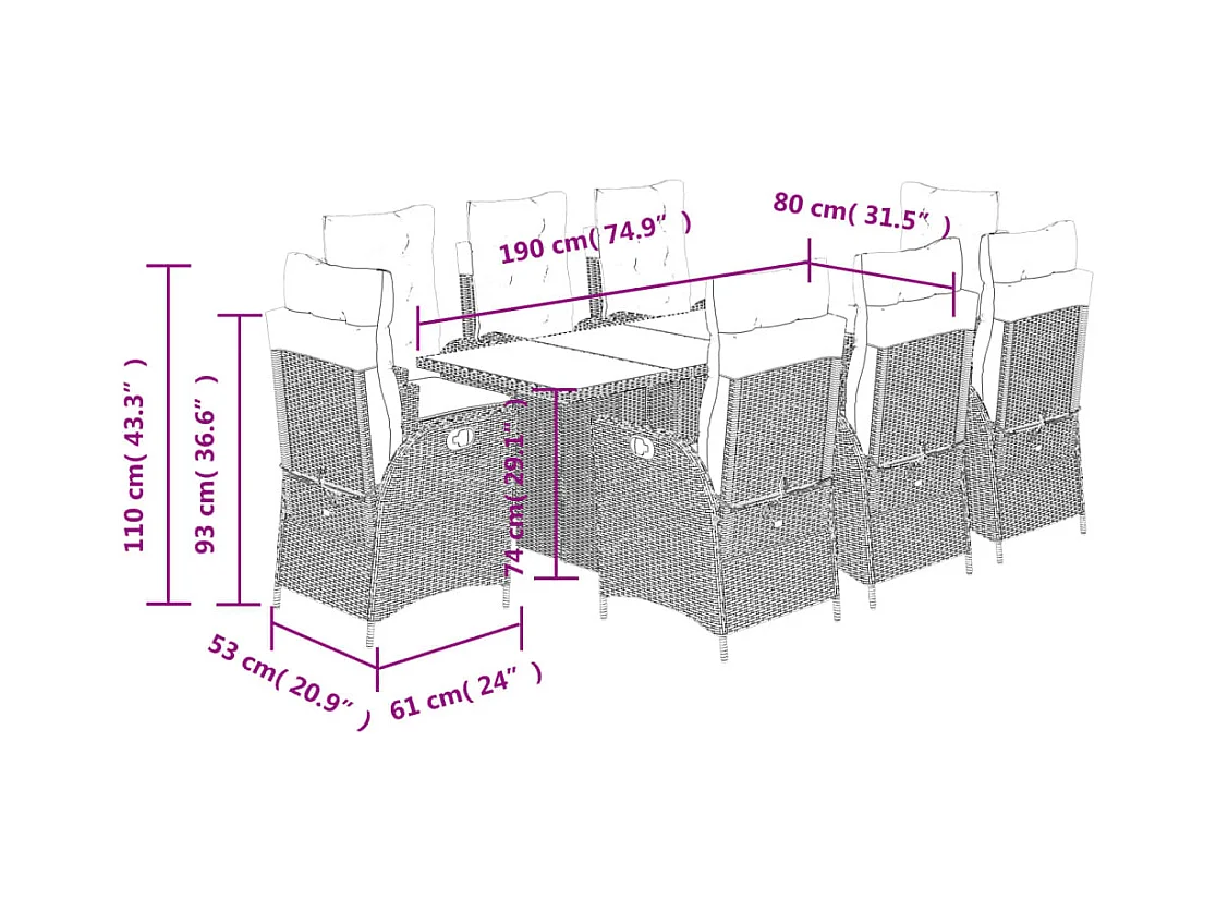 Ensemble à manger de jardin 9pcs coussins noir résine tressée